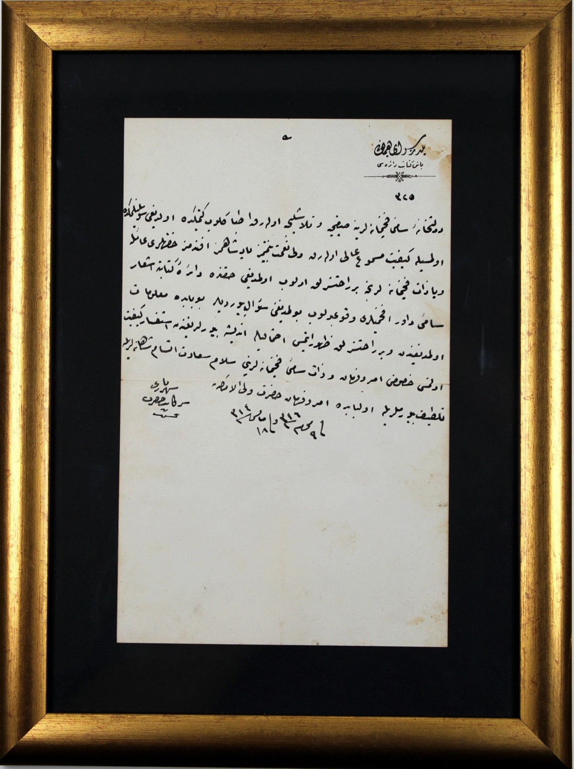 Yıldız Saray-ı Hümayun Baş Kitabet Dairesi antetli Osmanlıca belge, Hazreti Şehriyari ser-katip