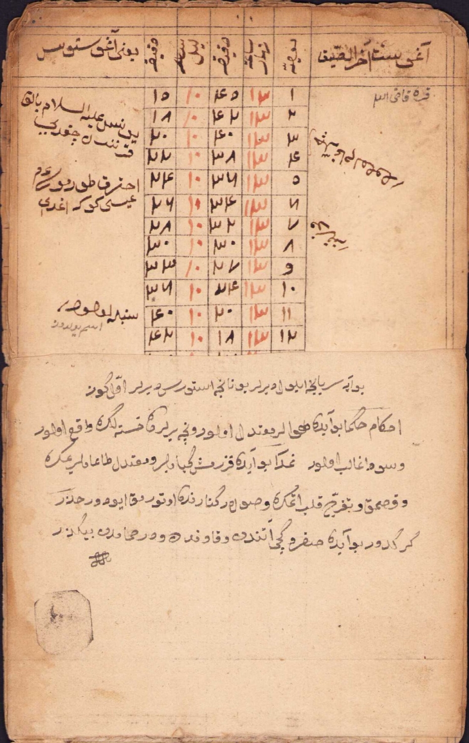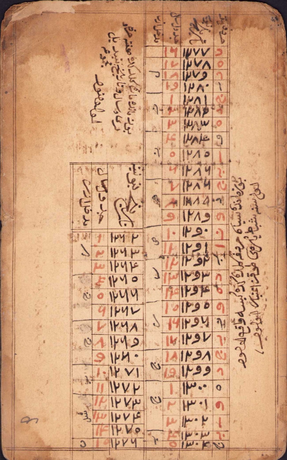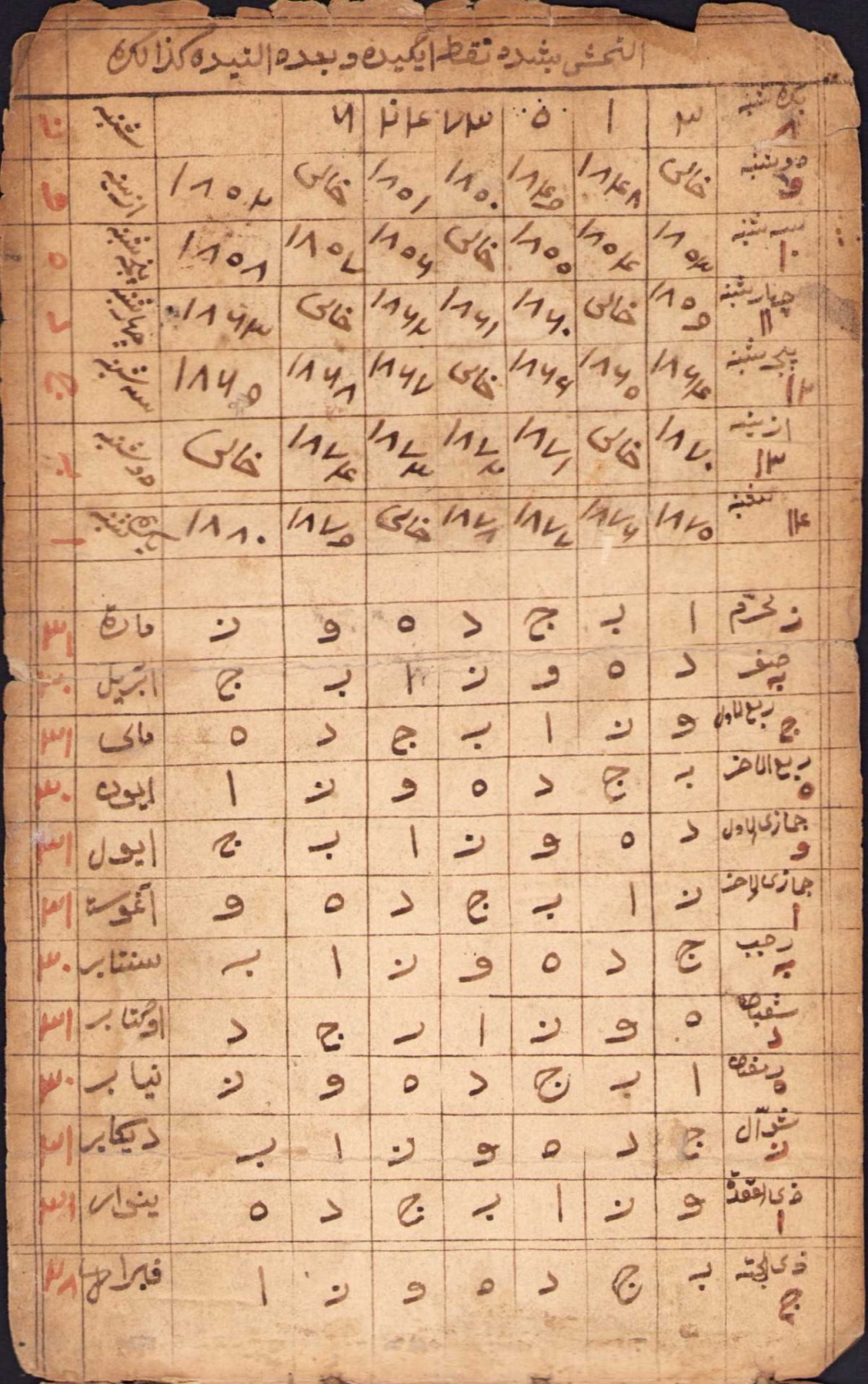 Cönk şeklinde olup ay ve günlerle birlikte hesaplamalar ve cetveller içeren defter, Osmanlıca, 9 varak, 10,5x17,5 cm.