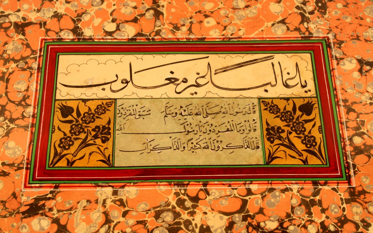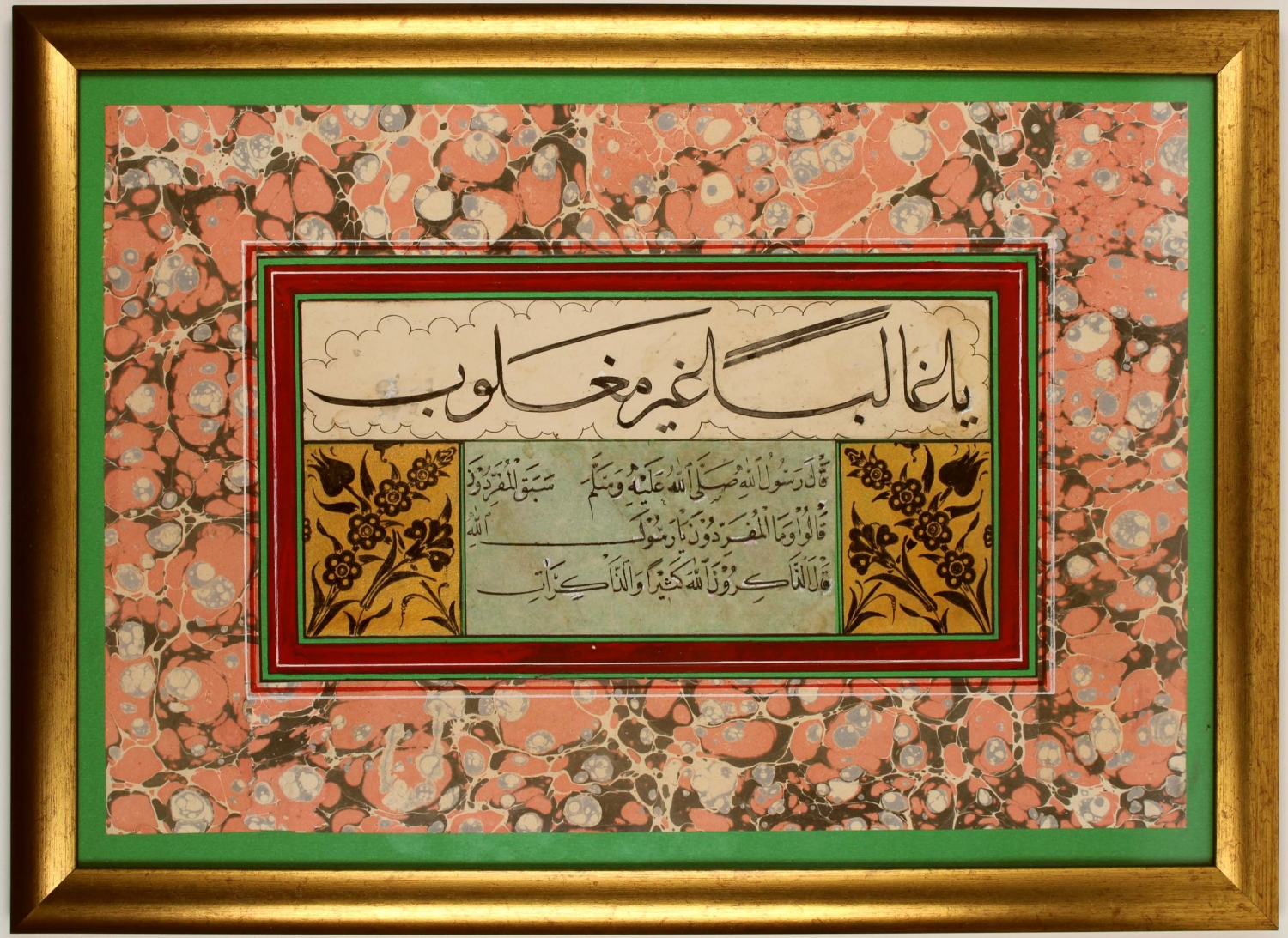 Celi sülus, sülüs kıta, "Ya Galiben gayra mağlub" ve Hadis-i şerif, ebrulu, çerçeveli, 44x31 cm.