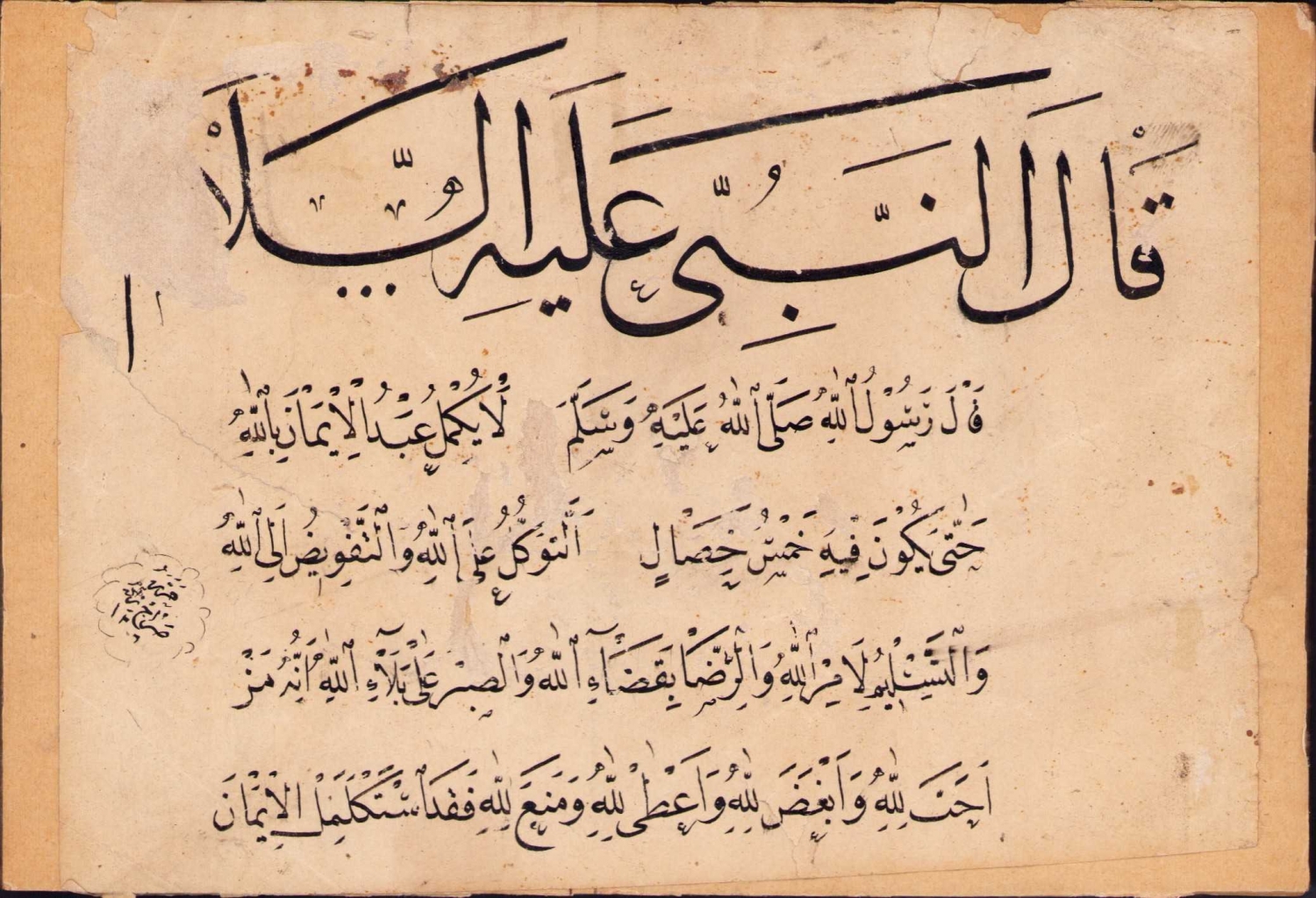 Sülüs Nesih kıta, Hadis-i Şerif, Saraçzade ketebeli, tahta üzerine yapıştırılmış, 16x12 cm.