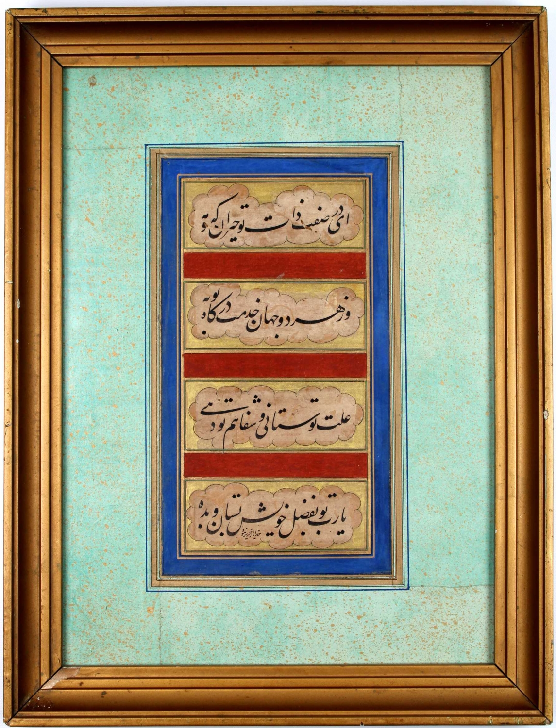 Eski dönem İran talik kıta, Hoca işi, ketebeli Hüdayar tahrir Nemud, altın cetvel ve zerefşanlı, çerçeveli, 28,5x37 cm.