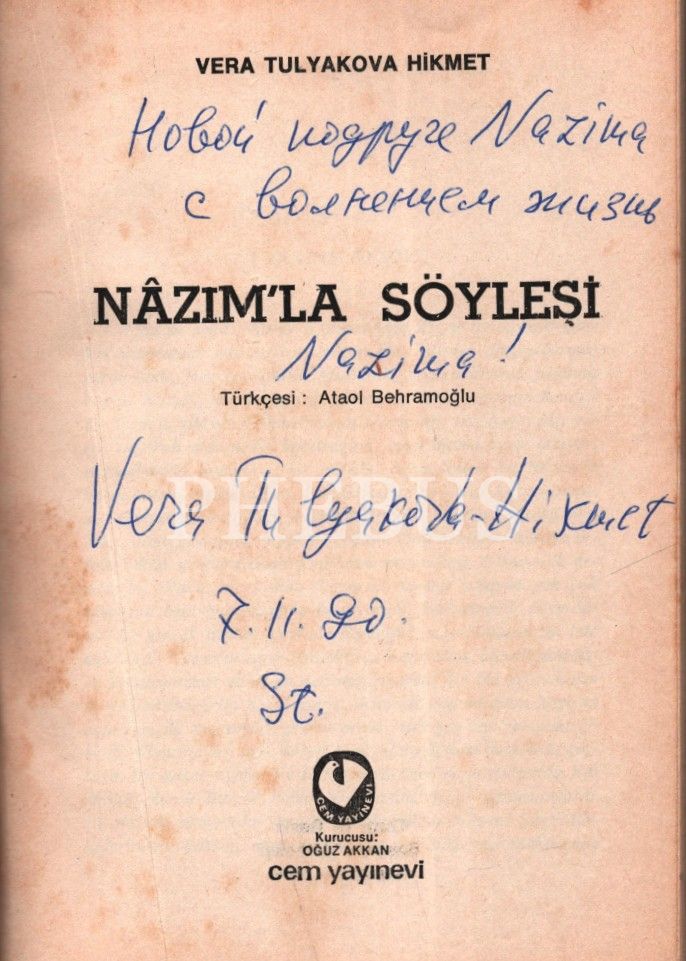 Vera Tulyakova Hikmet´ten ithaflı ve imzalı NÂZIM´LA SÖYLEŞİ, çeviren: Ataol Behramoğlu, Cem Yayınevi, İstanbul - 1989, 442 sayfa metin + görseller, 14x20 cm