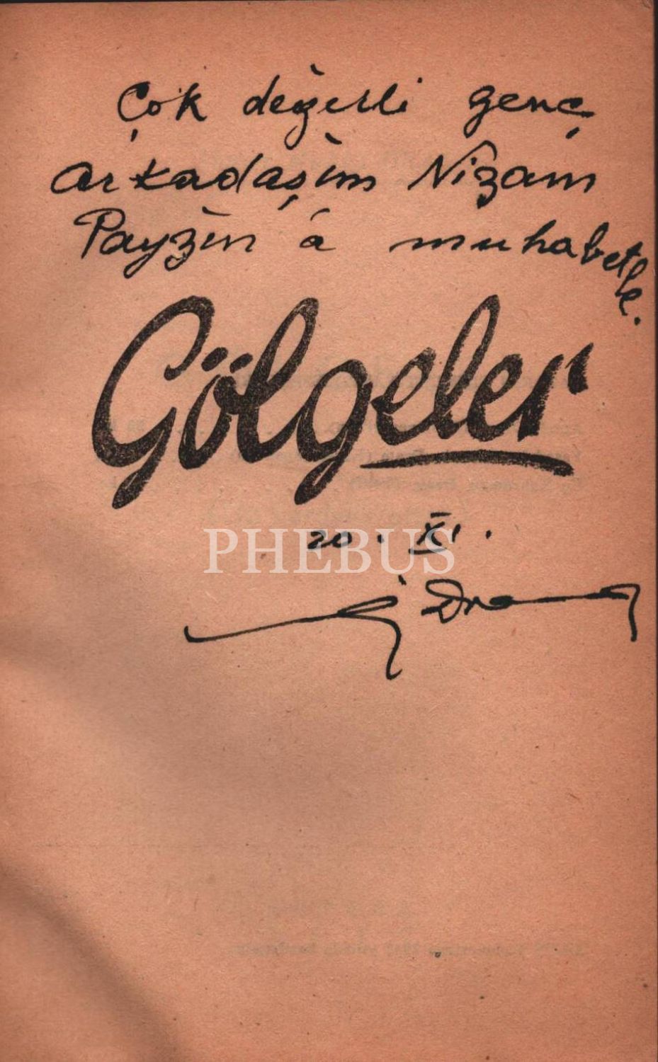 Ahmet Muhip Dranas´tan Nizam Payzın´a ithaflı ve imzalı GÖLGELER (Üç Perdelik Piyes), Ulus Basımevi, Ankara - 1947, 127 sayfa, 14x20 cm
