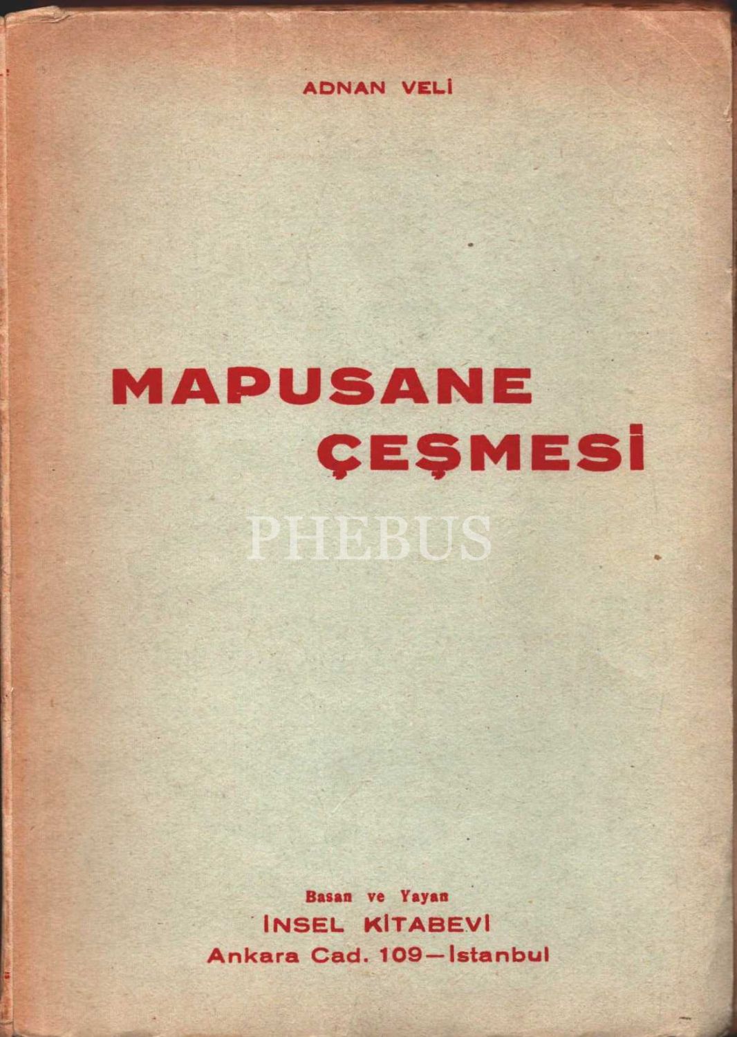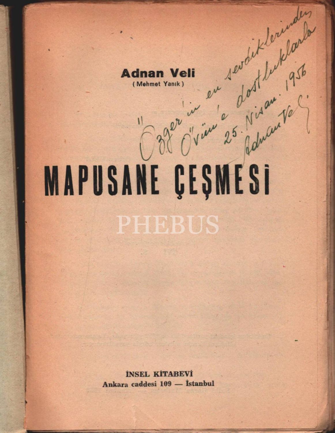 Adnan Veli´den ithaflı ve imzalı MAPUSANE ÇEŞMESİ, İnsel Kitabevi, İstanbul - 1952, 224 sayfa, 15x21 cm