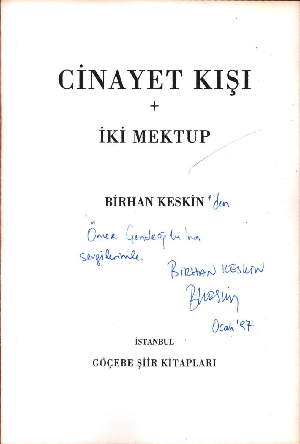Birhan Keskin´den Ömer Çendeoğlu´na ithaflı ve imzalı CİNAYET KIŞI + İKİ MEKTUP, Göçebe Şiir Kitapları, İstanbul - Kasım 1996, 54 sayfa, 13x19 cm