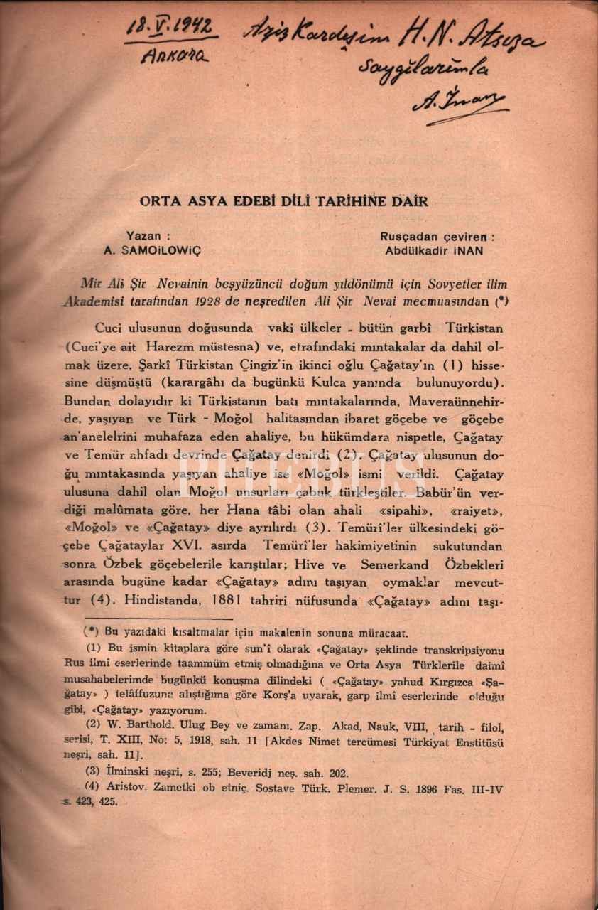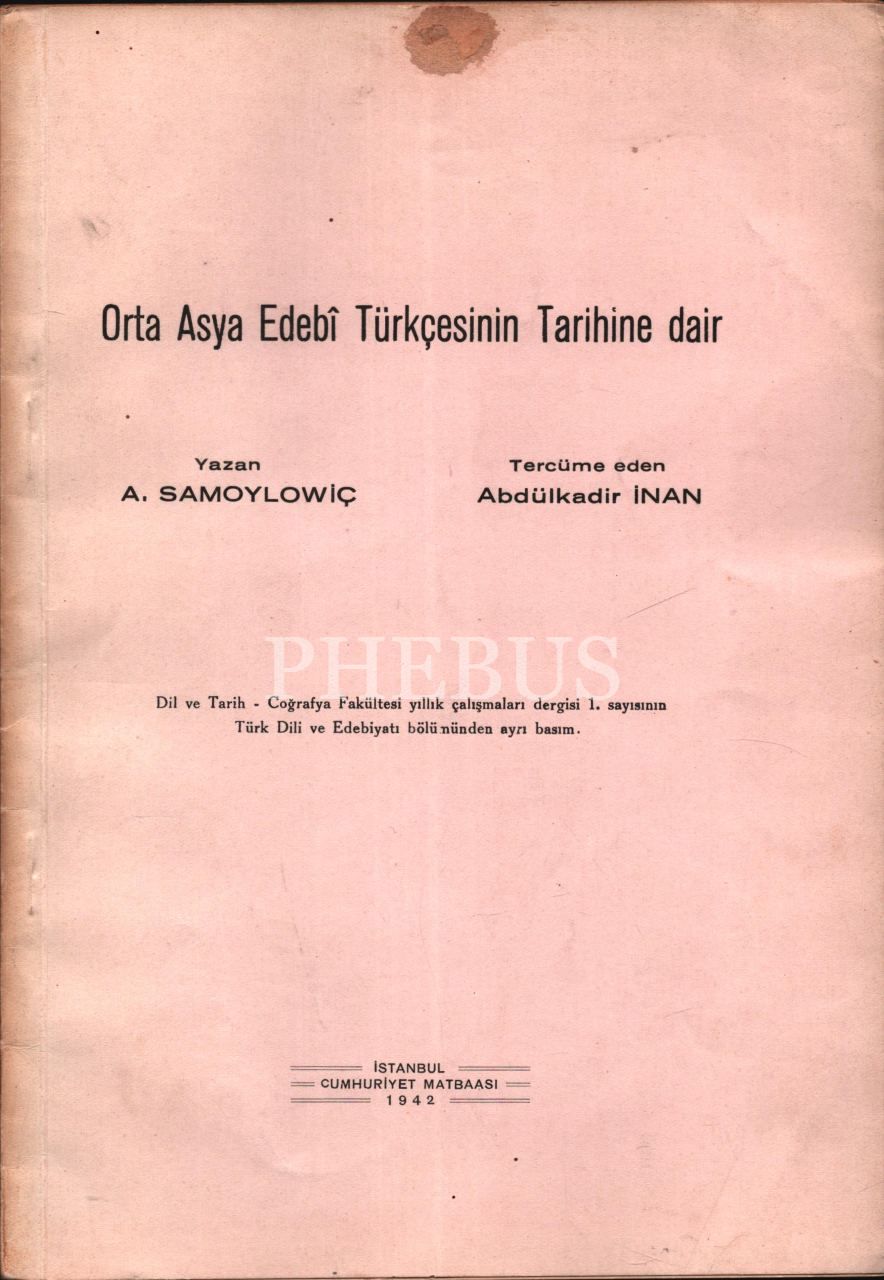 Tercüme eden Abdülkadir İnan´dan Hüseyin Nihal Atsız´a ithaflı ve imzalı ORTA ASYA EDEBÎ TÜRKÇESİNİN TARİHİNE DAİR, A. Samoylowiç, Cumhuriyet Matbaası, İstanbul - 1942, 94 sayfa, 17x24 cm