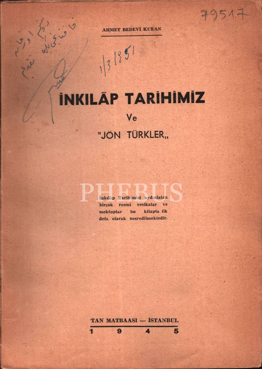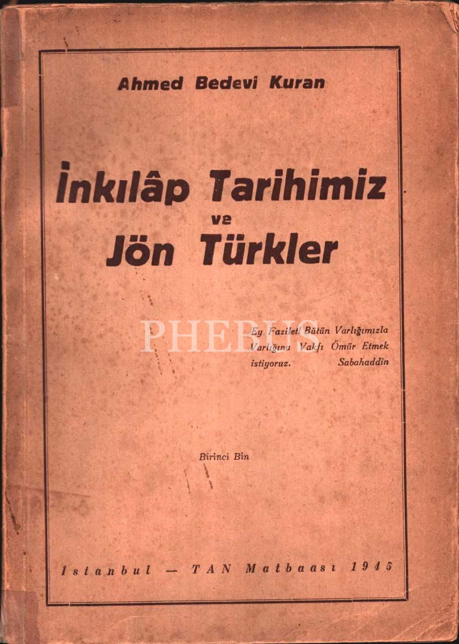 Ahmed Bedevî Kuran´dan ithaflı ve imzalı İNKILÂP TARİHİMİZ VE JÖN TÜRKLER, Tan Matbaası, İstanbul - 1945, 378 sayfa, 18x25 cm