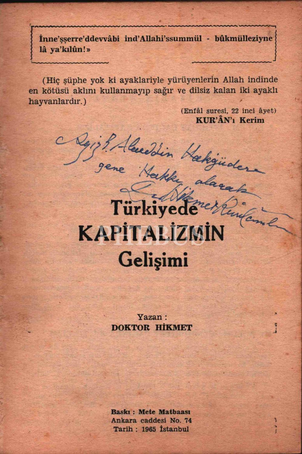 İthaf, "Zeki Can, Bu kitap takviyelidir. İlgine yeniden teşekkür ederek, çekik gözlerinden ? eyleyerek. F. Otyam 94" şeklindedir.