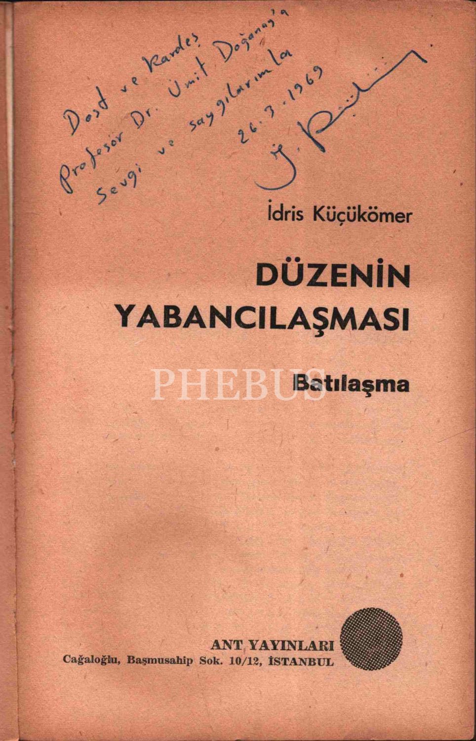 İdris Küçükömer´den Ümit [Yaşar] Doğanay´a ithaflı ve imzalı DÜZENİN YABANCILAŞMASI (Batılılaşma), Ant Yayınları, İstanbul - Nisan 1969, 162 sayfa, 12x20 cm