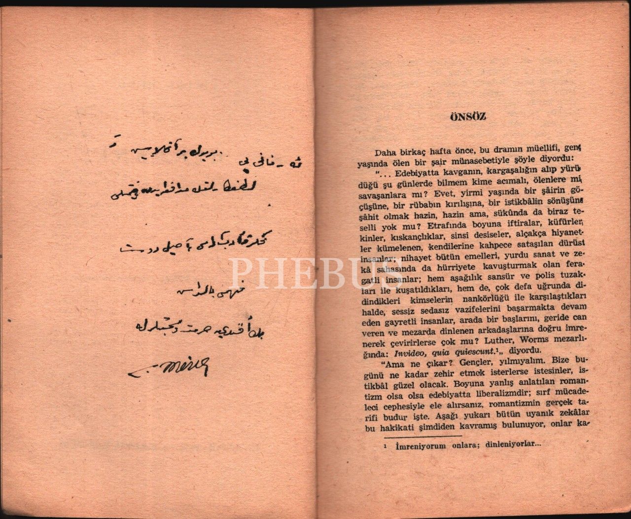 İthaf, "Ernani´yi büyük bir anlayış ve lütufkârlıkla müdafaa eden ? Asil Dost Fehmi Baldaş Beyefendiye hürmet ve muhabbetlerle.C. Meriç" şeklindedir.