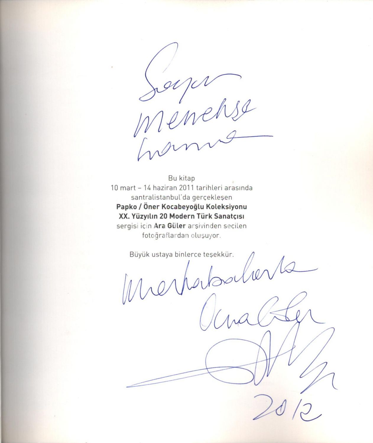 İthaf, "Sayın Menekşe hanıma Merhabalarla. Ara Güler 2012" şeklindedir.