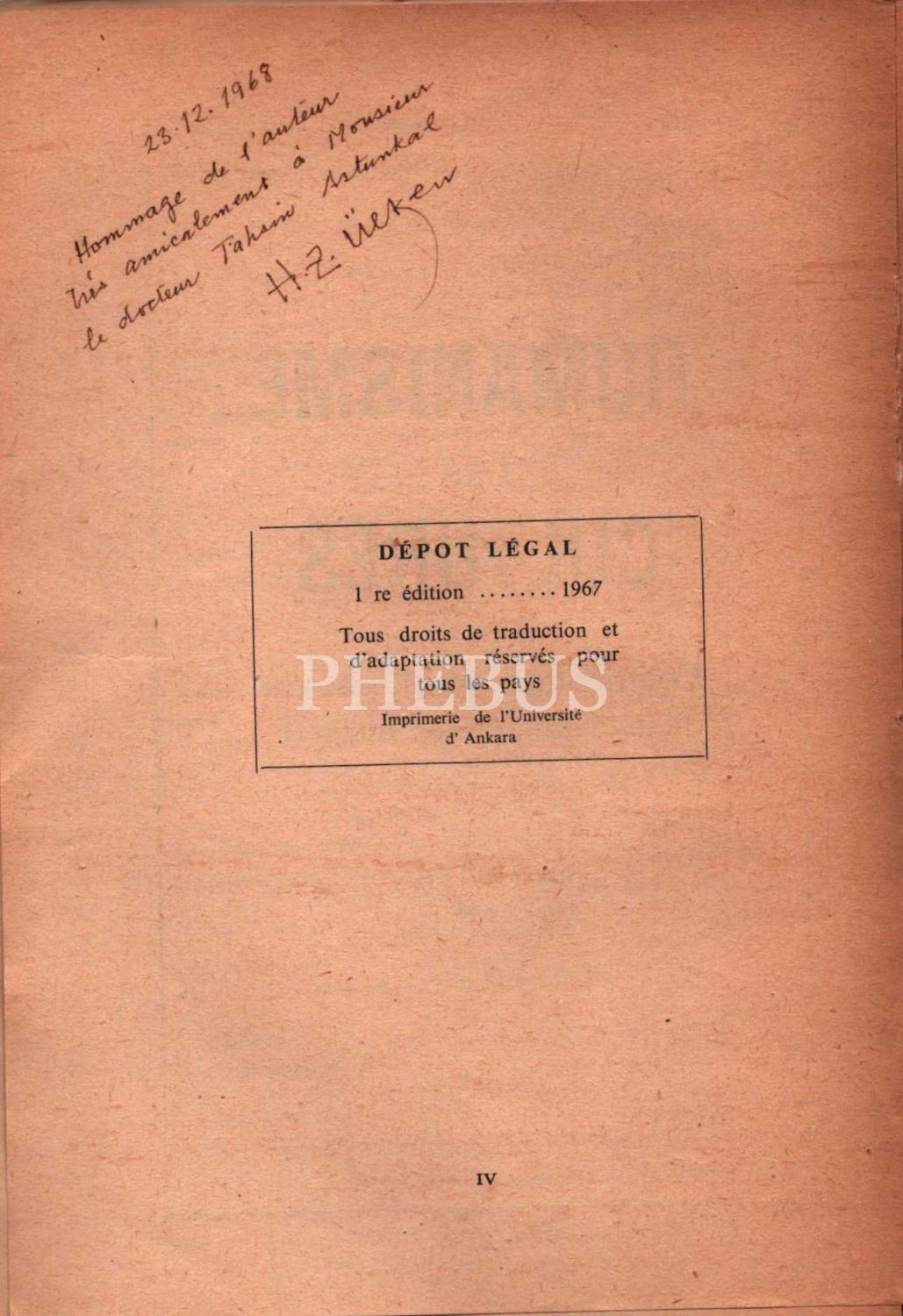 Hilmi Ziya Ülken´den ithaflı ve imzalı HUMANISME DES CULTURES, Ankara Üniversitesi İlâhiyat Fakültesi Yayınları, 1967, 216 sayfa, 17x24 cm