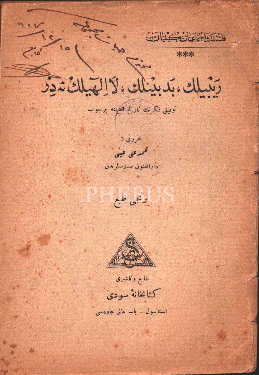 Yayıncıdan ithaflı ve imzalı REYBÎLİK, BEDBÎNLİK, LÂİLÂHÎLİK NEDİR, Mehmed Ali Ayni, Kitabhane-i Sudî, İstanbul - 1927, 87 sayfa, 14x19 cm