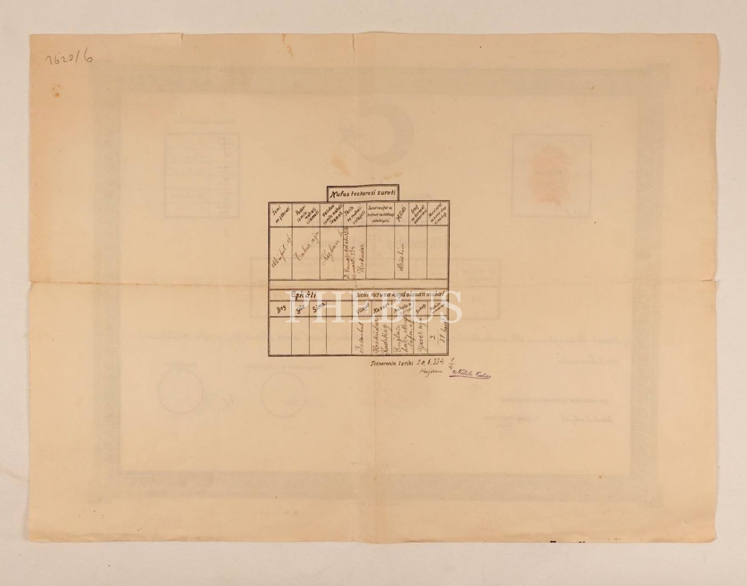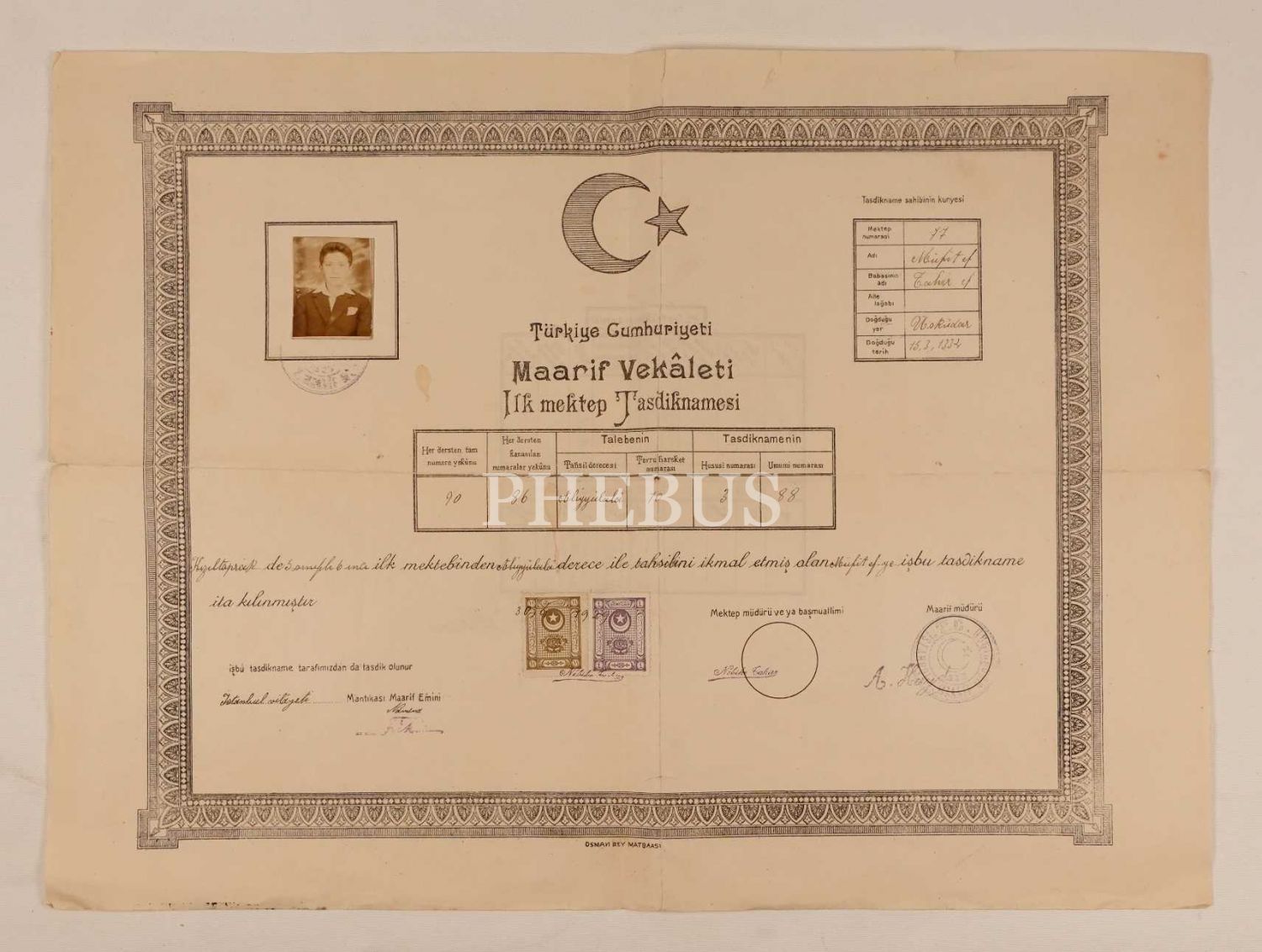 Müfit Efendi´ye ait "aliyyü´l-a´lâ" dereceli, fotoğraflı ilkokul tasdiknamesi [diploma], Kızıltoprak/İstanbul 1929, 35x47 cm
