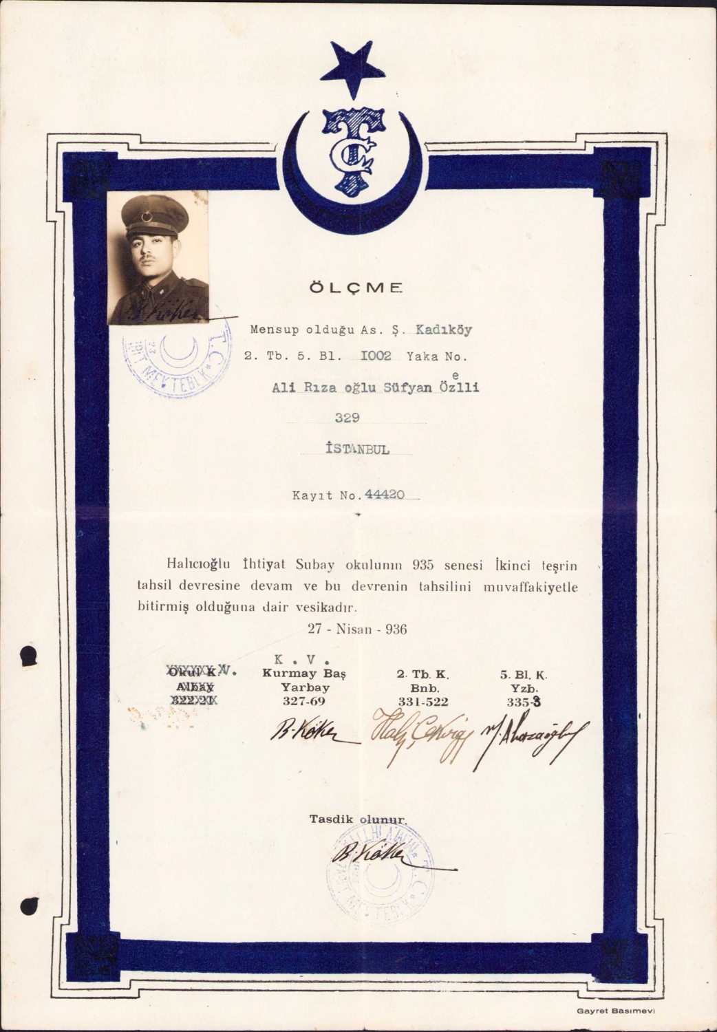 Kadıköy Halıcıoğlu İhtiyat Subay okuluna başarı belgesi, 1936 tarihli, 22x32 cm.