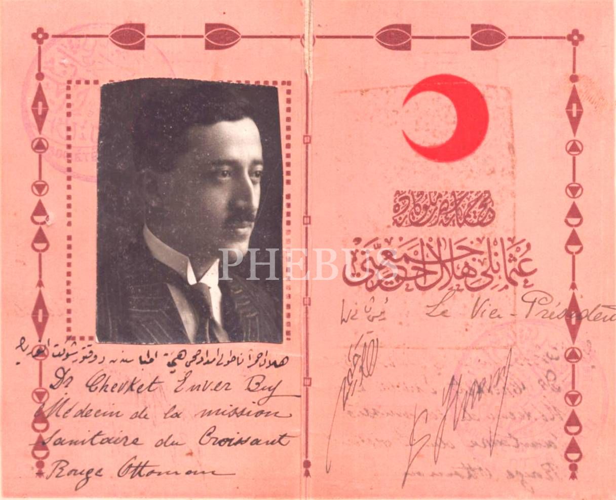 Osmanlı Hilal-i Ahmer Cemiyeti doktorlarından Şevket Enver Bey´e ait fotoğraflı Osmanlıca-Fransızca kimlik, 14x18 cm