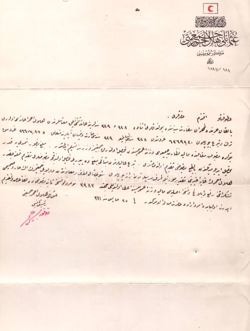 Osmanlı Hilal-i Ahmer Cemiyeti İkinci Reisi Dr. Besim Ömer [Akalın] ıslak imzalı, bağış konulu mektup, 1331, 21x33 cm