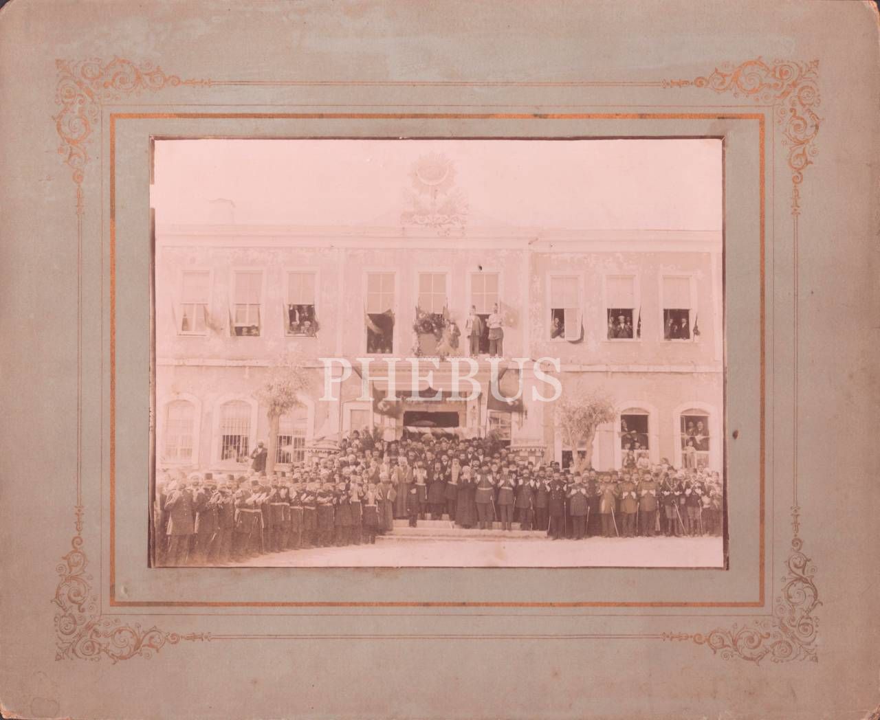 Türk bayraklarının asılı olduğu bina önünde dua eden devlet erkânı ile sivil halk, paspartu: 27x33 cm