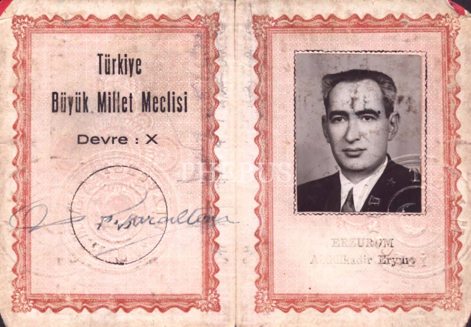Refik Koraltan imzalı, Erzurum Milletvekili Abdülkadir Eryurt´a ait fotoğraflı TBMM kimliği, 7x10 cm