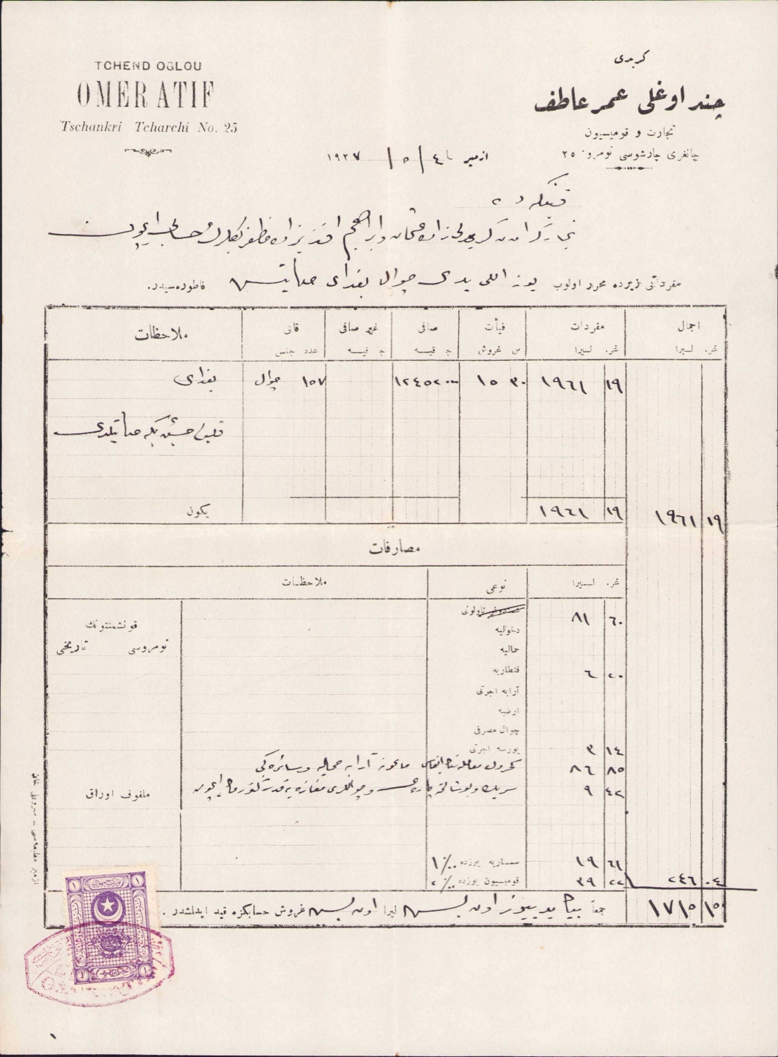 Osmanlıca - Fransızca Giridi Çendoğlu Ömer Atıf Ticaret ve Komisyon - İzmir antetli, postadan geçmiş 1927 tarihli fatura, 20x28 cm.
