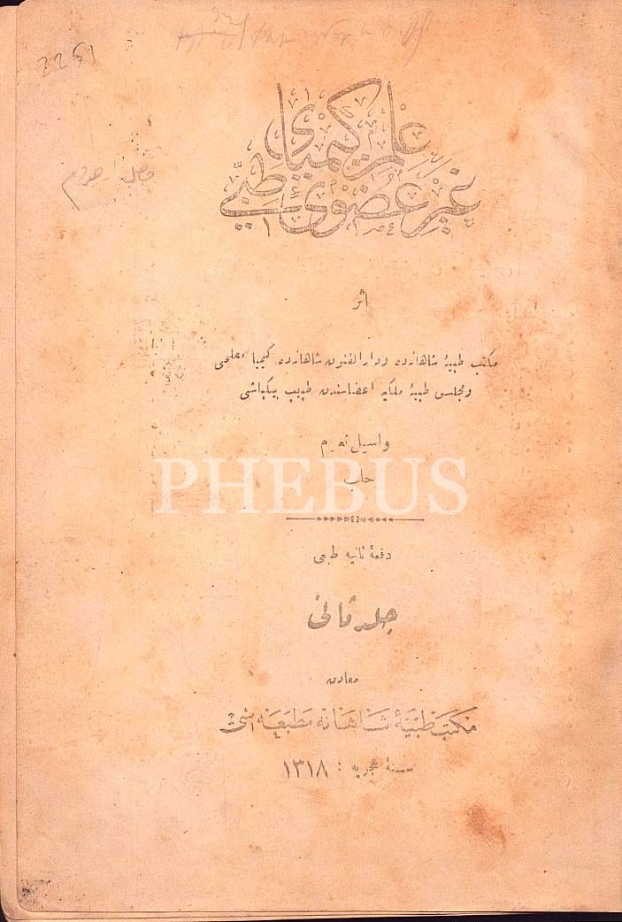 Osmanlı armalı cildinde İLM-İ KİMYÂ-YI GAYRİUZVÎ-İ TIBBÎ, Vasil Naum, Mekteb-i Tıbbiye-i Şahane-i Matbaası, 1318, 530 s., 17x24 cm