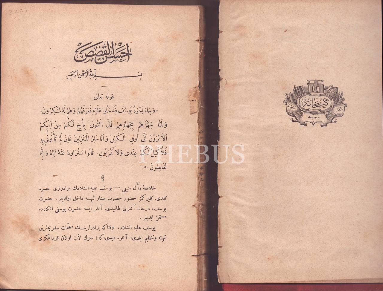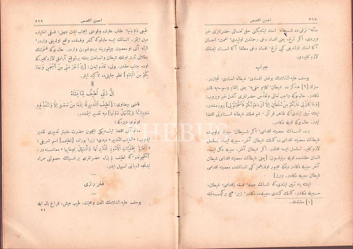 II. Abdülhamid tuğralı ve ay yıldızlı cildinde AHSENÜ´L-KASAS (Tefsîr-i Sûre-i Yûsuf- 3. Kısım), [Giritli] Sırrı Paşa, Şirket-i Mürettibiye Matbaası, İstanbul 1309, 470 s., 16x23 cm