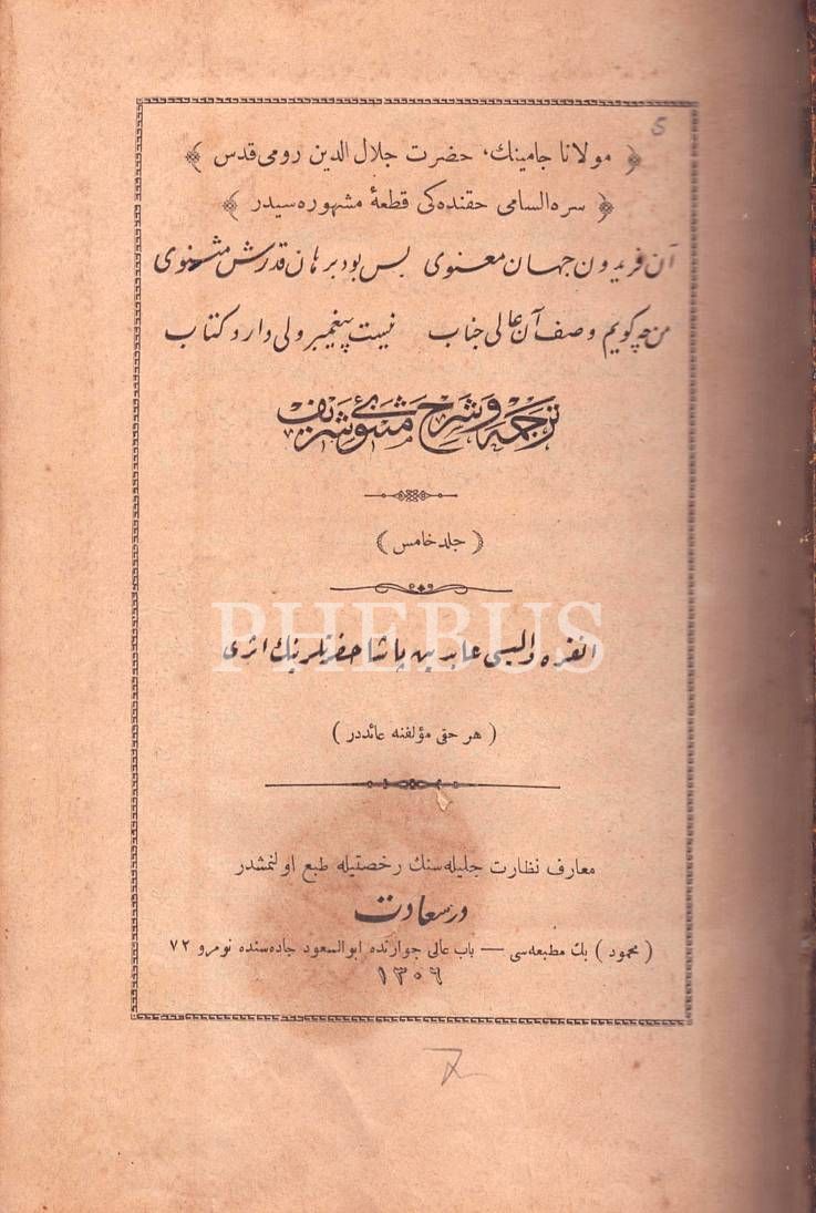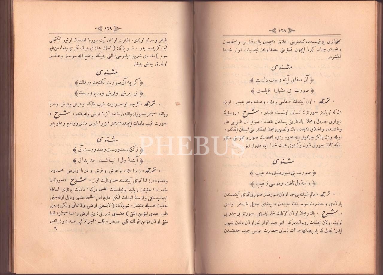 Osmanlı armalı ve deri sırtlı cildinde TERCÜME VE ŞERH-İ MESNEVÎ-İ ŞERÎF (5. ve 6. Cilt), Ankara Valisi Âbidin Paşa, Mahmud Bey Matbaası, İstanbul 1306, 349+384 s., 17x24 cm