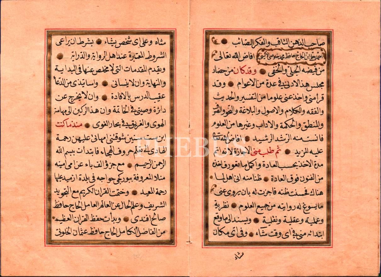 Osmanlı armalı ve ay yıldızlı saray işi özel kadife kutusu ve cildi ile, Hafız Mehmed Emin el-İzmidî tarafından Ahmed b. Mehmed adlı kişiye verilen Arapça el yazma ilmiye icazetnamesi, 1319, 26 s., 16x22 cm