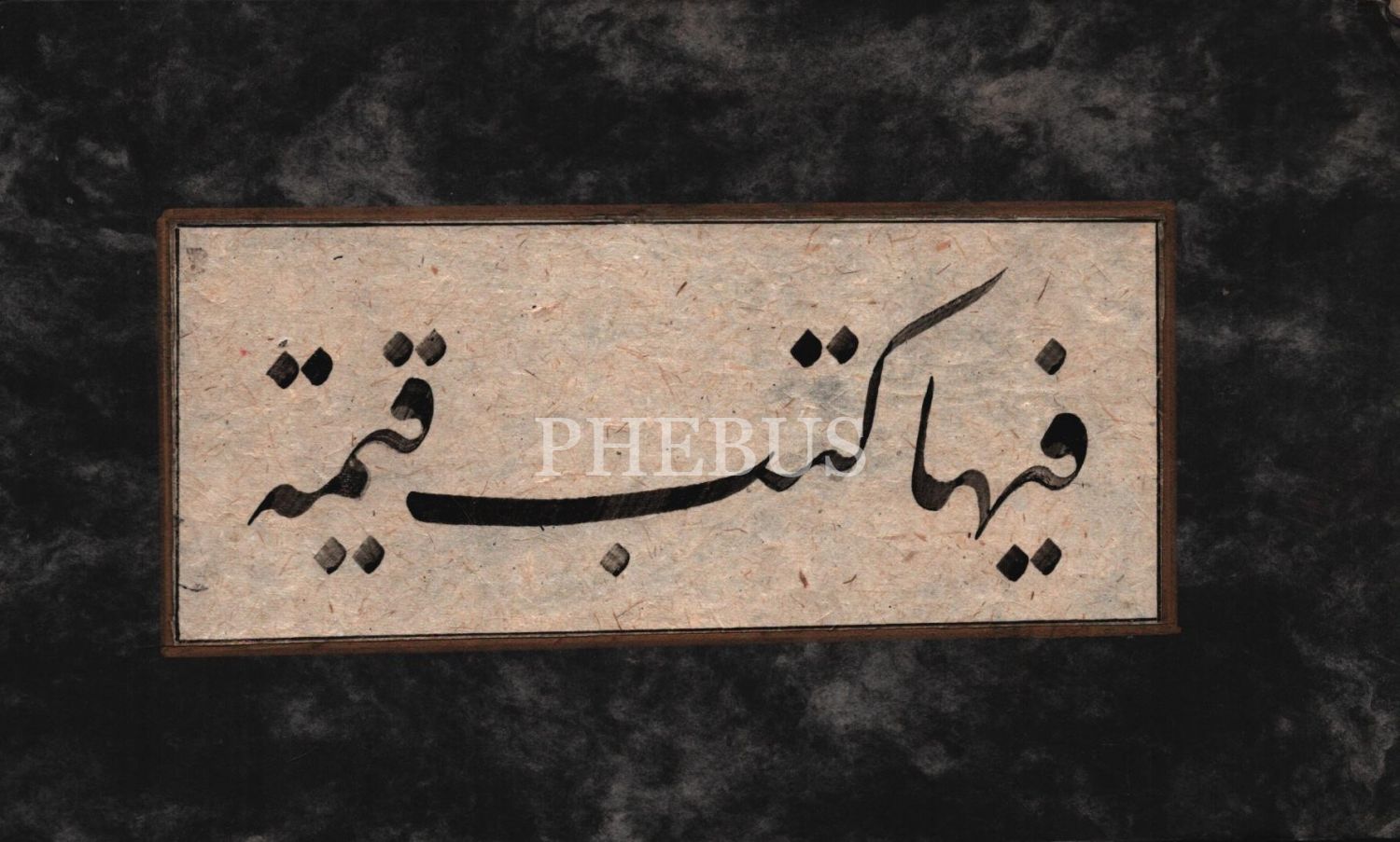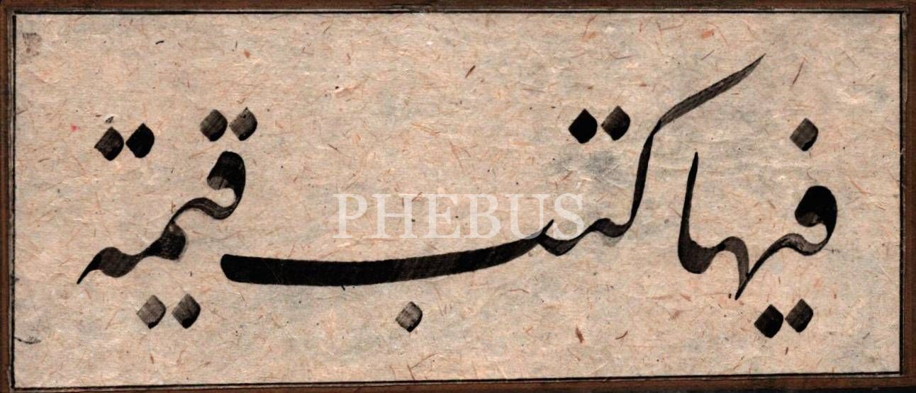 Ta´lîk hatla ayet: "Fîhâ kütübün kayyime" [Beyyine/3], altın cetvelli yazı: 7x16 cm; paspartu: 14x24 cm