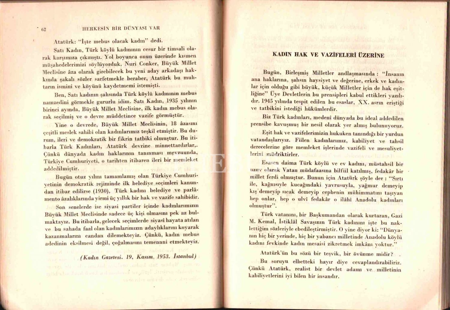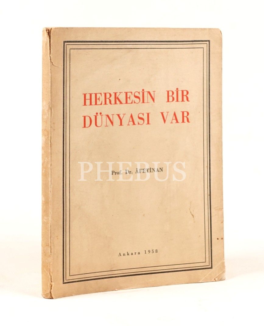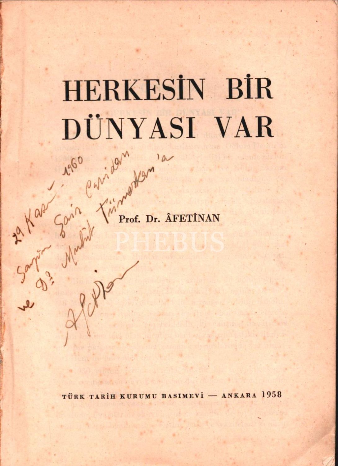 Yazarı Âfet İnan´dan ithaflı ve imzalı HERKESİN BİR DÜNYASI VAR, Türk Tarih Kurumu Basımevi, Ankara 1958, 191 s., 14x19 cm