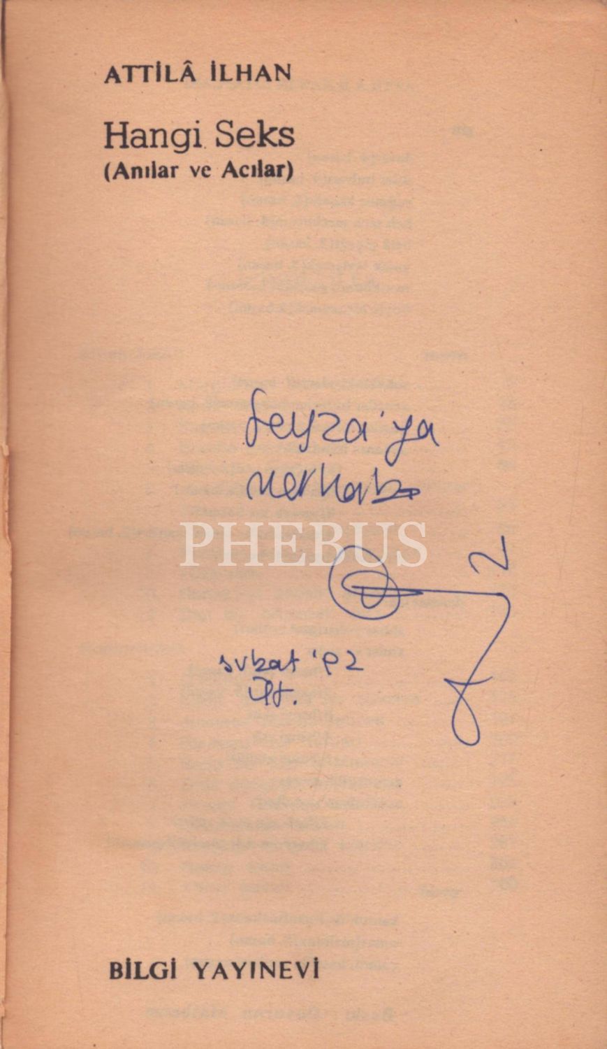 Attilâ İlhan´dan ithaflı ve imzalı HANGİ SEKS (Anılar ve Acılar), Bilgi Yayınevi, İstanbul 1982, 302 s., 11x19 cm