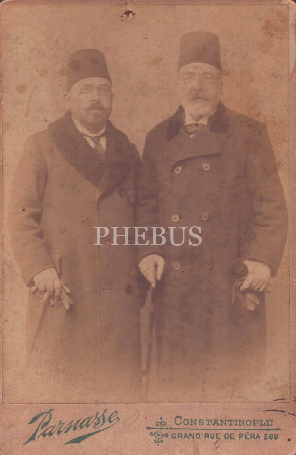 Asil duruşlu iki Osmanlı beyefendisinin hatıra kabin fotoğrafı, Parnasse Fotoğrafhanesi- Constantinople, 11x16 cm