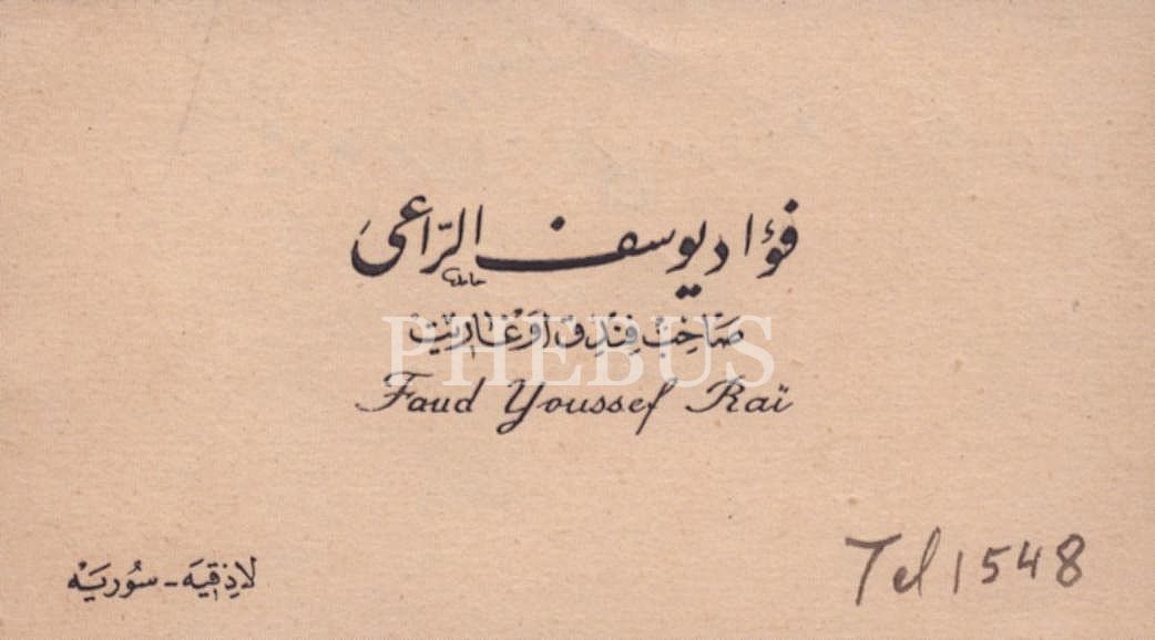 Ugarit Oteli Sahibi Fuad Yusuf el-Râi´ye ait Arapça kartvizit, Lazkiye/Suriye
