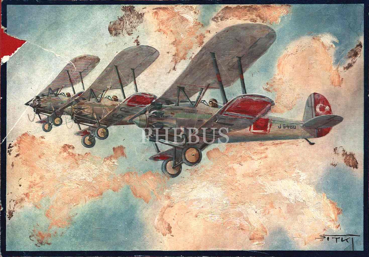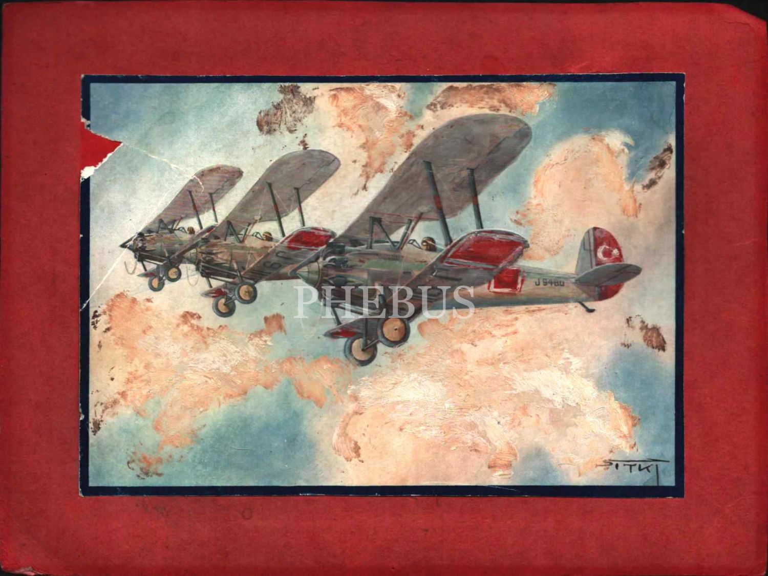 Sıtkı imzalı çift kanatlı, pervaneli uçak çizimi, 18x24 cm