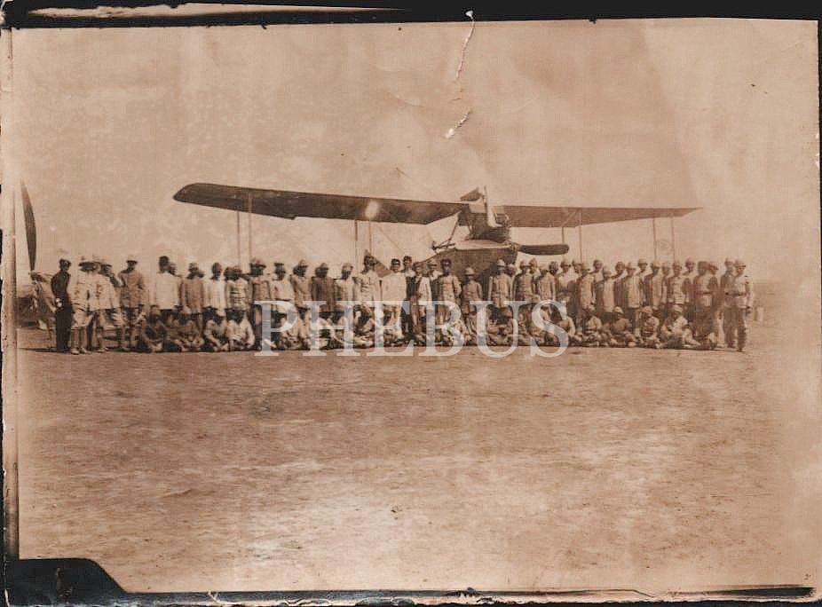Çift kanatlı, pervaneli uçakları önünde hatıra fotoğrafı çekilen pilotlar, 9x14 cm