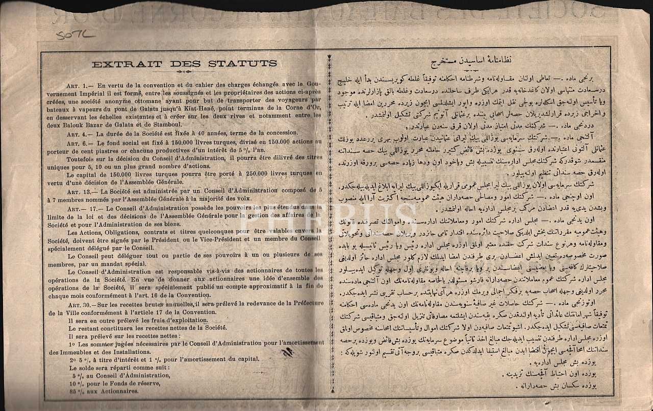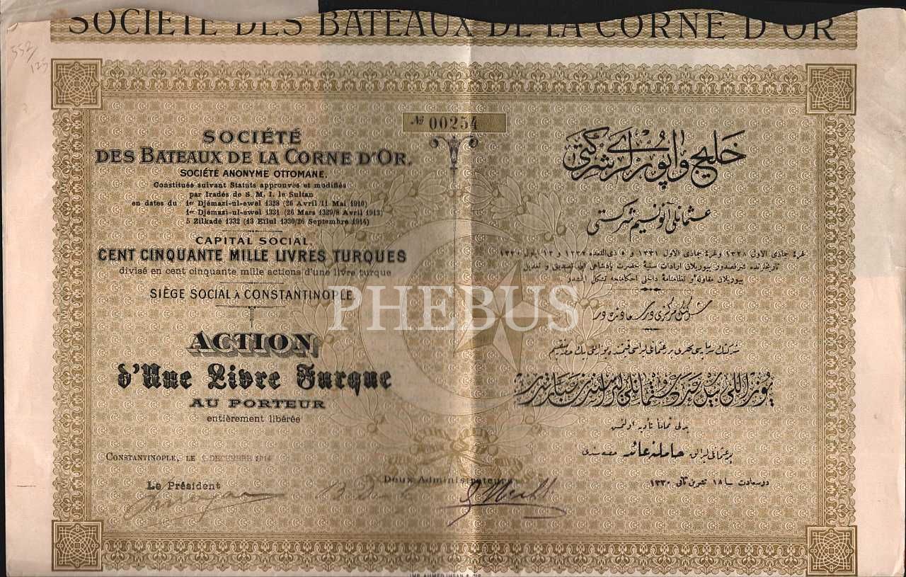 Haliç Vapurları Osmanlı Anonim Şirketi [Societé des Bateaux de la Corne d´Or] Hisse Senedi, Constantinople, 1 Aralık 1914, 37x47 cm