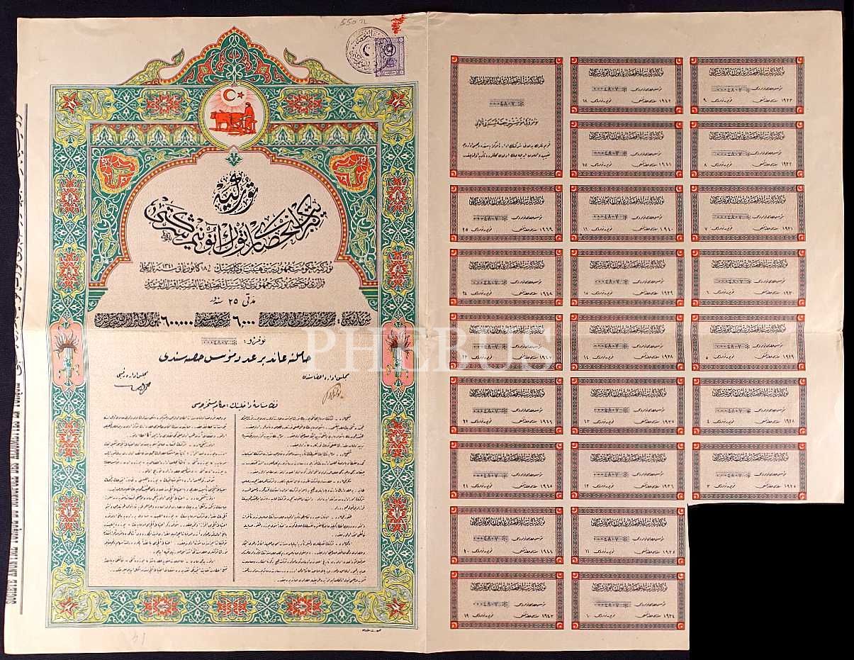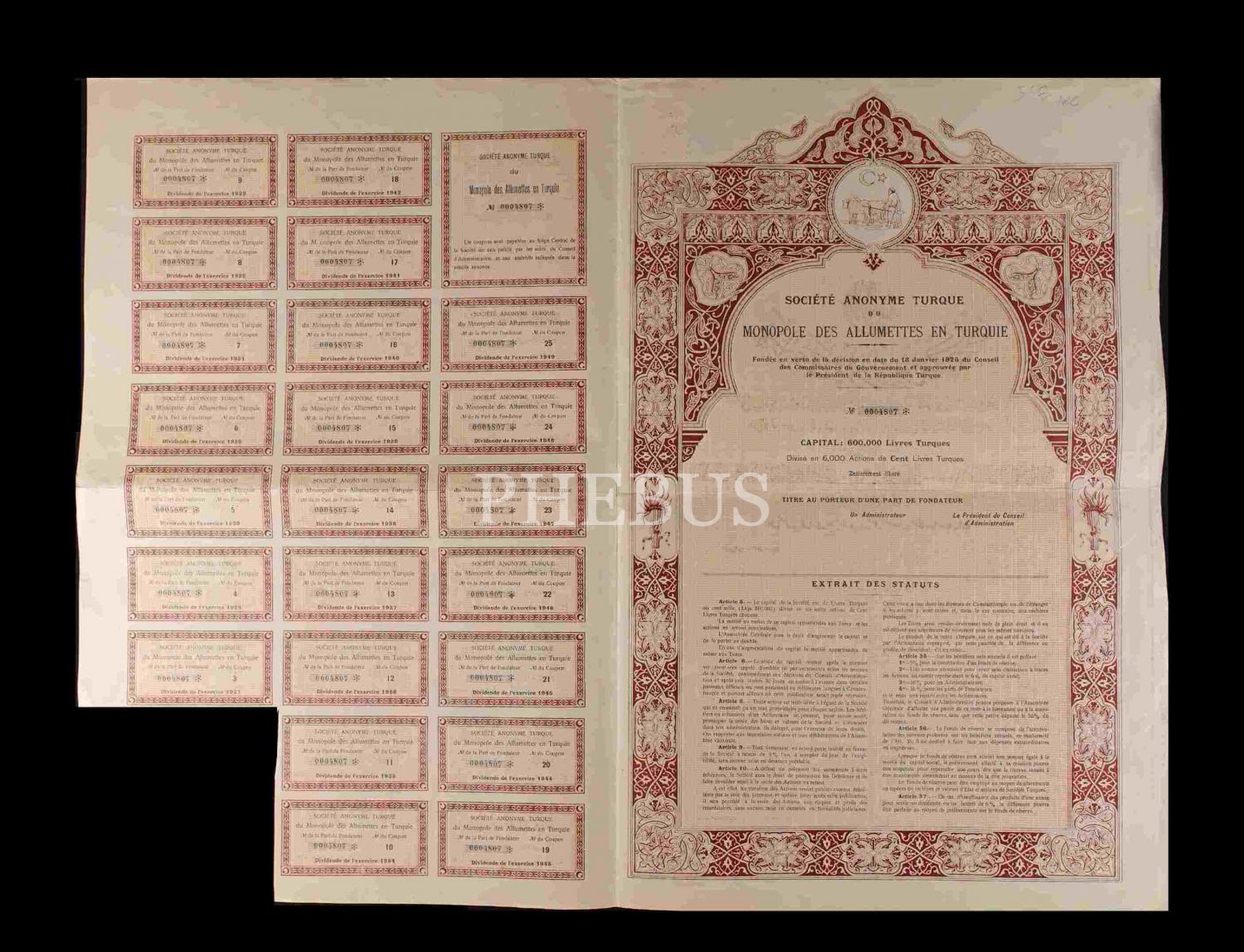 Türkiye Kibrit İnhisarı Türk Anonim Şirketi [Societe Anonyme Turque du Monopole des Allumettes en Turquie] Hisse Senedi, Cumhuriyet Matbaası, damgalı ve pullu, 32x49 cm