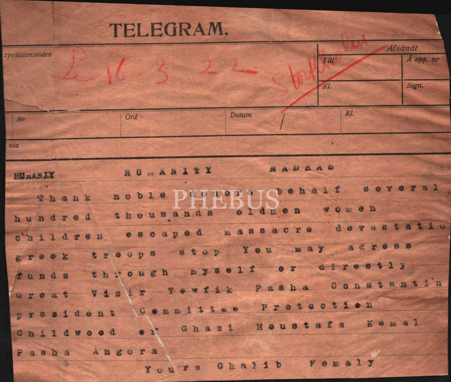 16 Mart 1922 Stockholm ‘dan gönderilmiştir. Yunan Askerlerinin pek çok Türk, yaşlı, kadın ve çocukları katlettiğini Tevfik Paşa ve Gazi Mustafa Kemal Paşa’ya acilen iletmelerini bildiriyor.