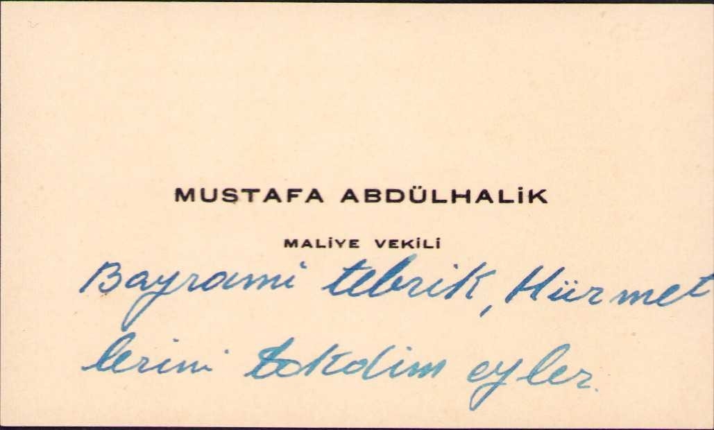 Maliye Vekili Mustafa Abdülhalik kartvizit, üzerinde bayram tebriği yazılı, 9x5 cm.