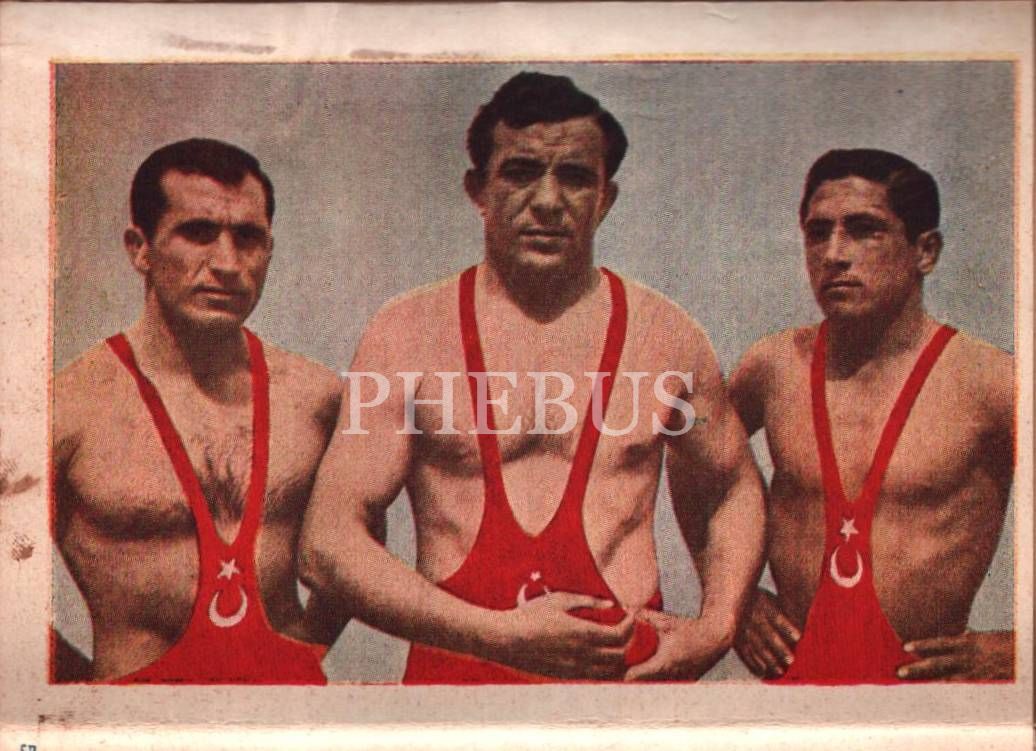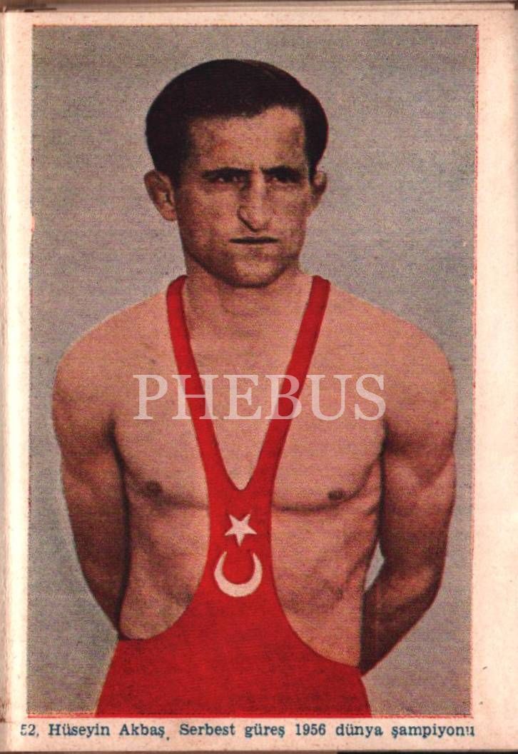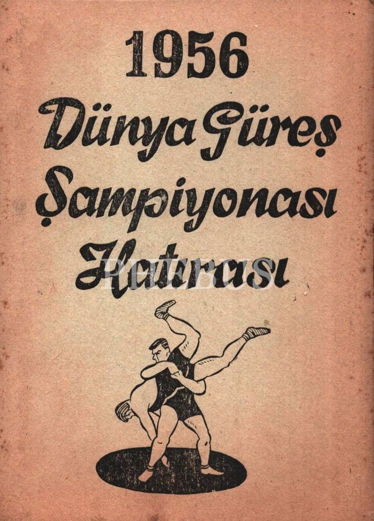 1956 Dünya Güreş Şampiyonası Hatırası yazılı kap içerisinde 15 adet akardiyon şeklinde güreşci görselleri, İstanbul Yayınevi, 10x14 cm