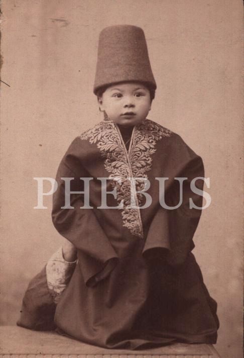 Başında semazen külâhı takılı sevimli Osmanlı çocuğu, J. Zilpoche et Ch. Bukmedjian Fotoğrafhanesi, Smyrne [İzmir], 6x10 cm