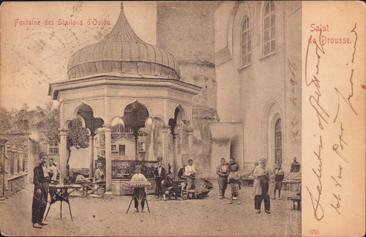 Osmanlı dönemi meslek kartpostalı, Bursa Ulu Cami Şadırvanı Çeşmesi önünde sokak satıcıları, postadan geçmiş.