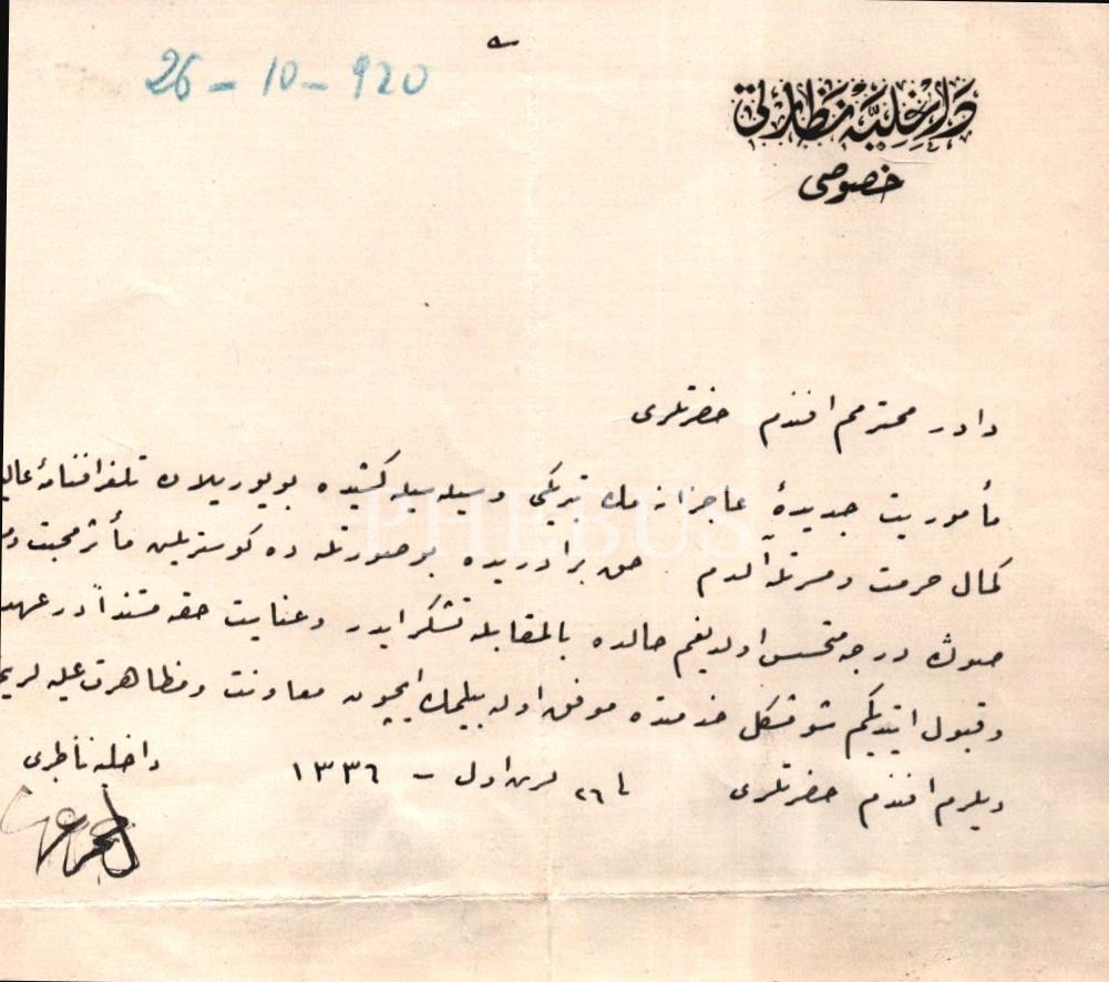 Ahmet İzzet Paşa´nın Dahiliye Nazırlığı görevindeyken yazdığı mektup, 26 Teşrinievvel 1336, 12x13 cm