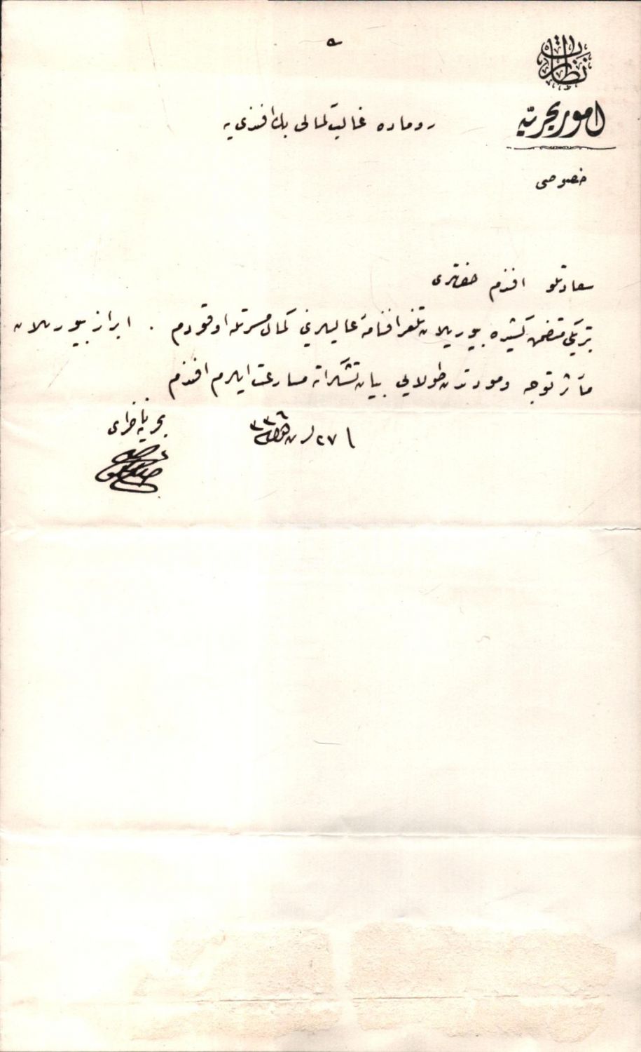 Bahriye nazırı Salih Hulusi Paşa tarafından Roma´da bulunan Galip Kemalî Beyefendi´ye gönderilen mektup, 26 Teşrin 1336, 14x23 cm