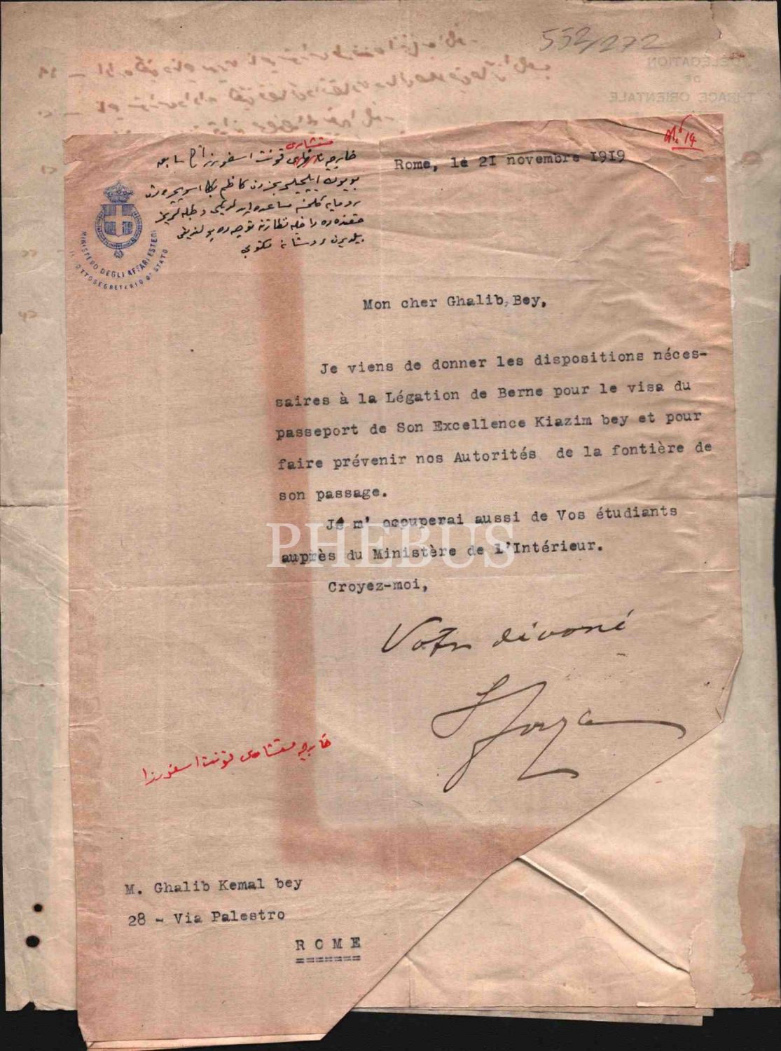 Teşkîlât-ı Esâsiye Kanunu Mevadd-ı Esâsîye ve Galip Kemalî Beyefendi´ye Roma´dan gönderilen Fransızca mektup, 21 Kasım 1919, 21x28 cm