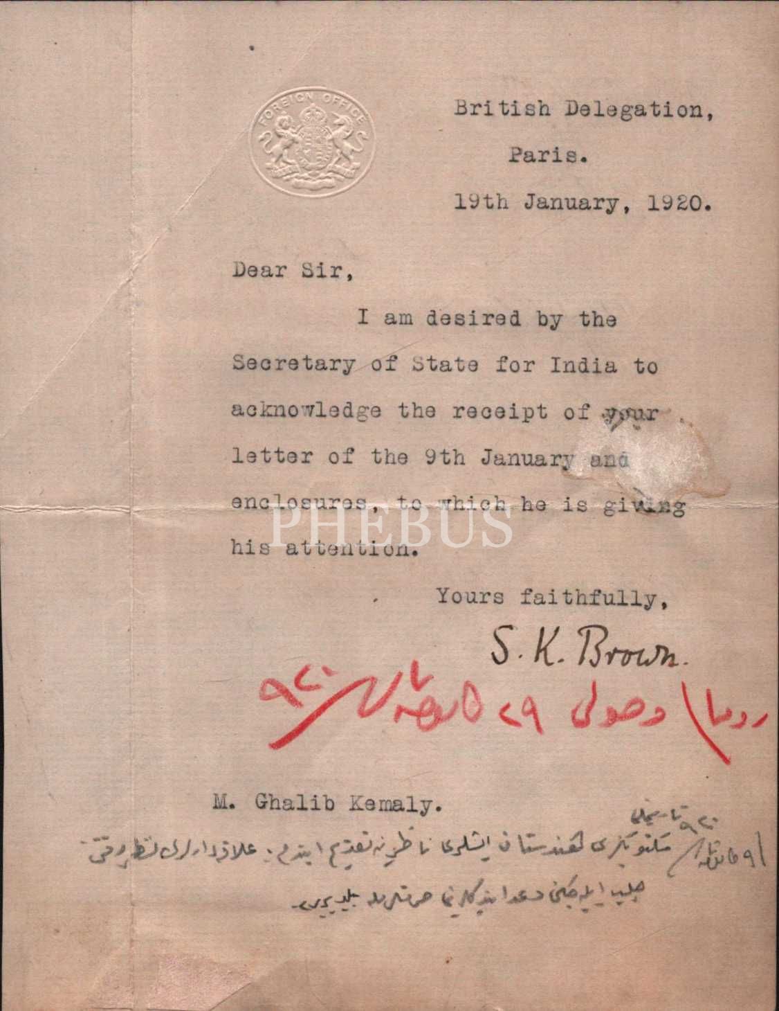 9 Ocak 1920 tarihli mektubu İngiltere’nin Hindistan İşleri Bakanına vermesinin ardından bakanın yapılan şikayetlerle yakından ilgileneceğine dair mektubu.