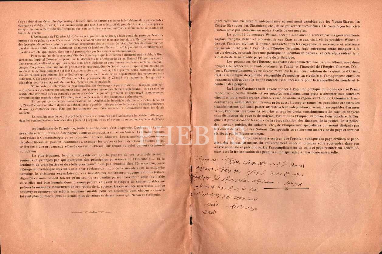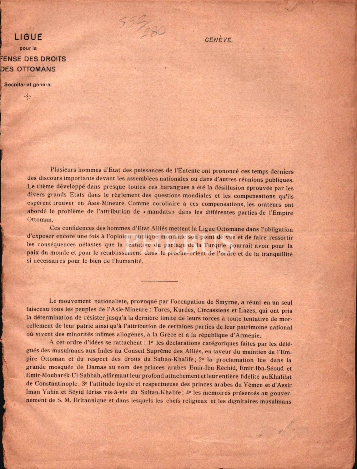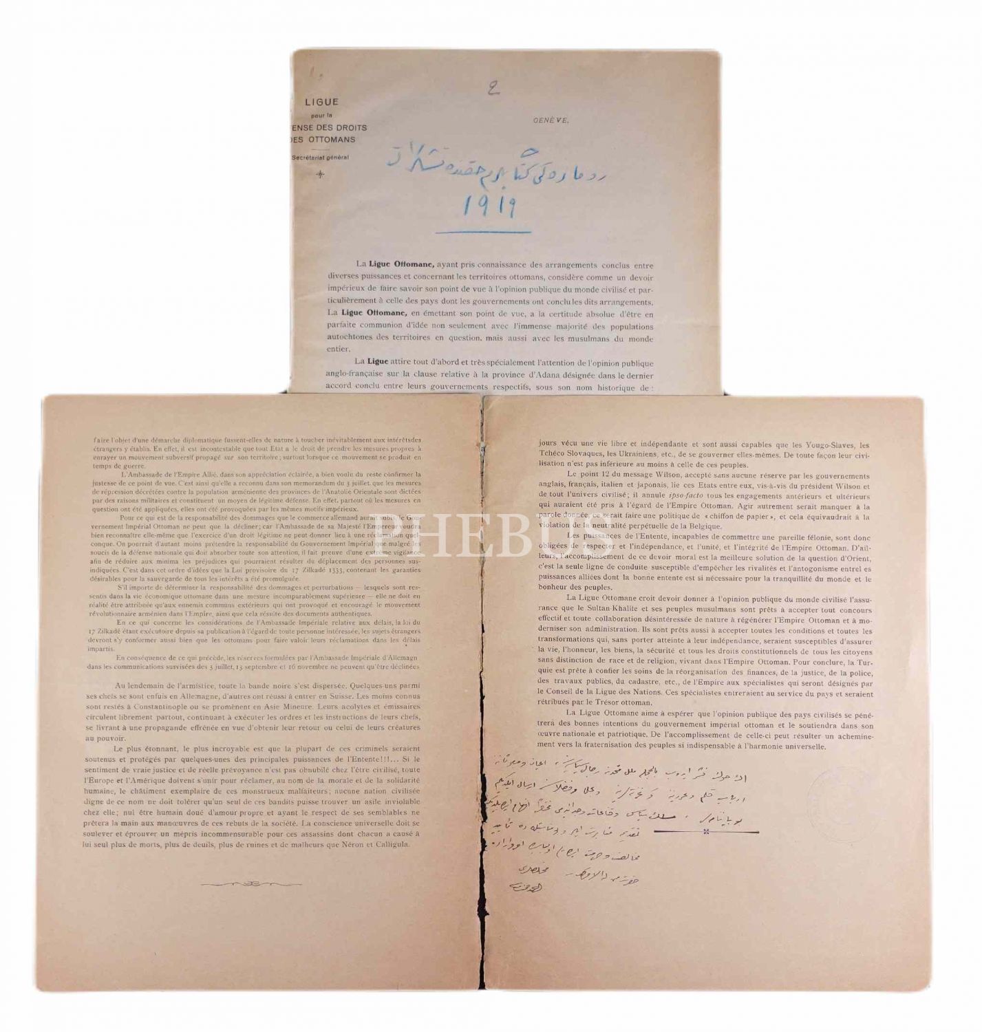 Ahmet Muhtar Paşa´nın, Galip Kemalî Beyefendi´ye yazdığı notun bulunduğu Ligue Pour La Fense Des Droits Des Ottomans [Osmanlı Müdafaa-i Hukuk Cemiyeti] ile ilgili Fransızca broşür, 21x28 cm