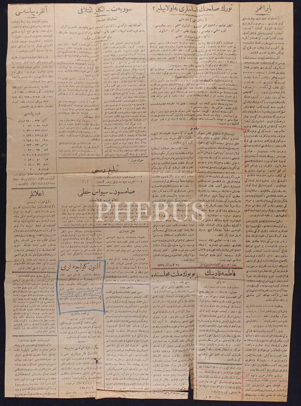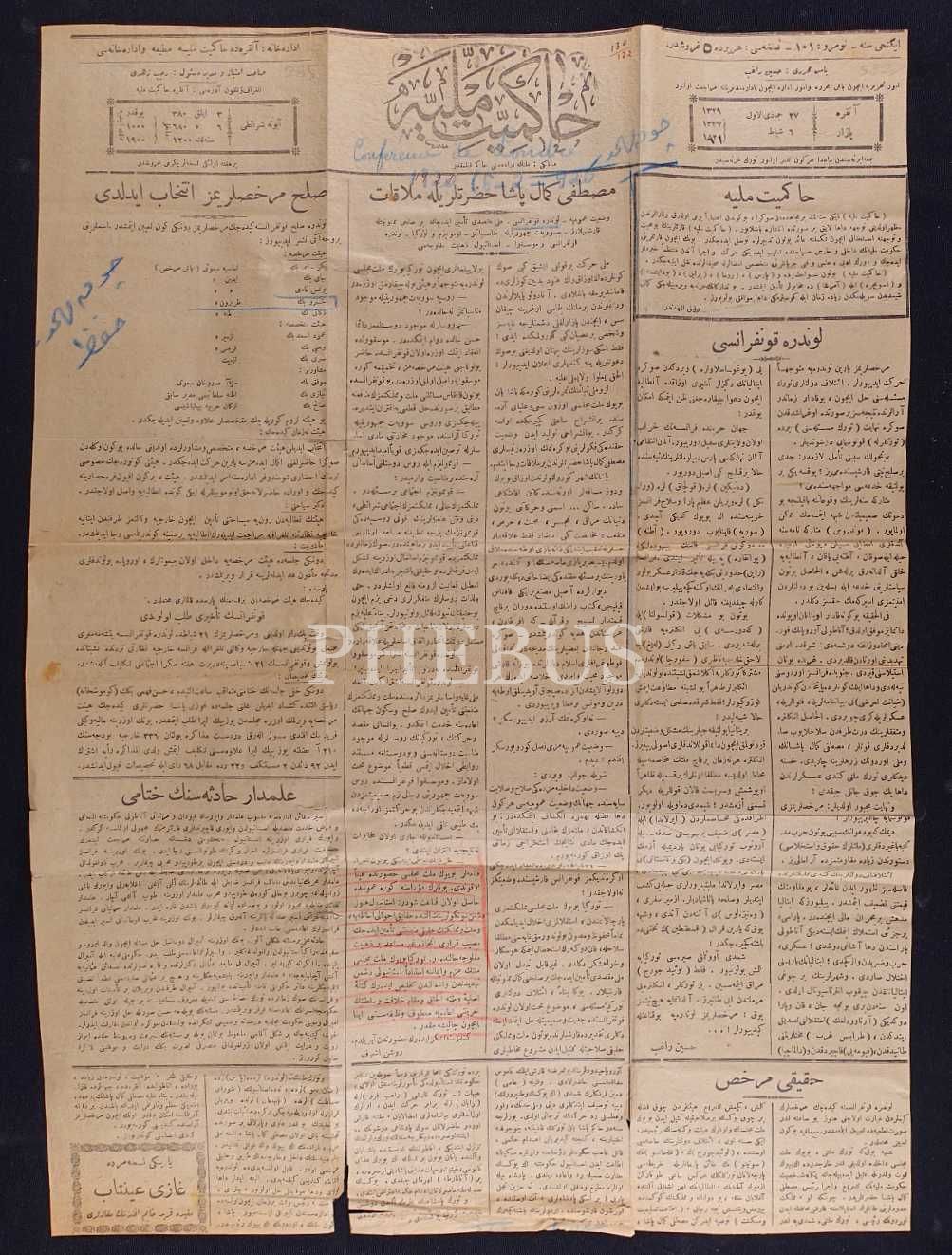 HAKİMİYET-İ MİLLİYE gazetesinin Mustafa Kemal Paşa Hazretleriyle Mülakat" başlıklı 101. sayısının sayfası, 6 Şubat 1921, 40x55 cm