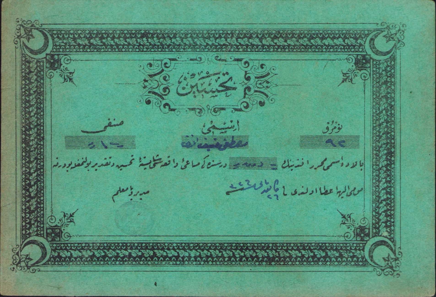 Osmanlıca Tahsin belgesi, 1326 tarihli, 16x11 cm.