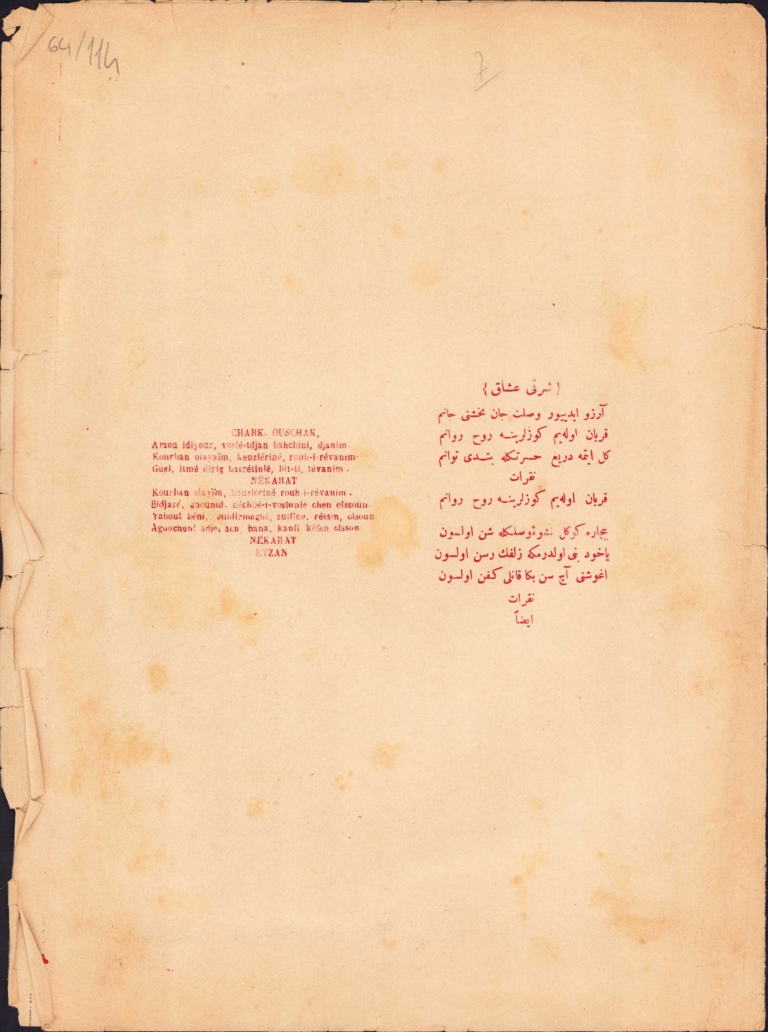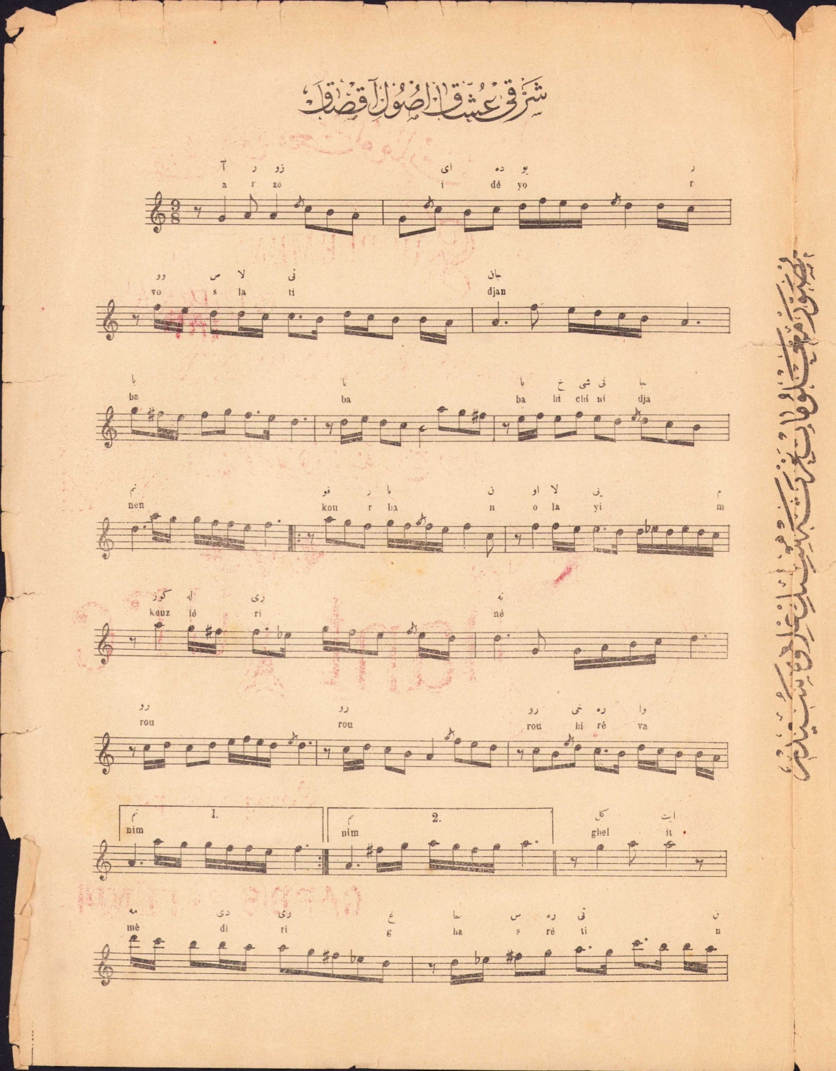 Osmanlıca Garbis Efendinin Uşak şarkı notası, haliyle, 24x34 cm